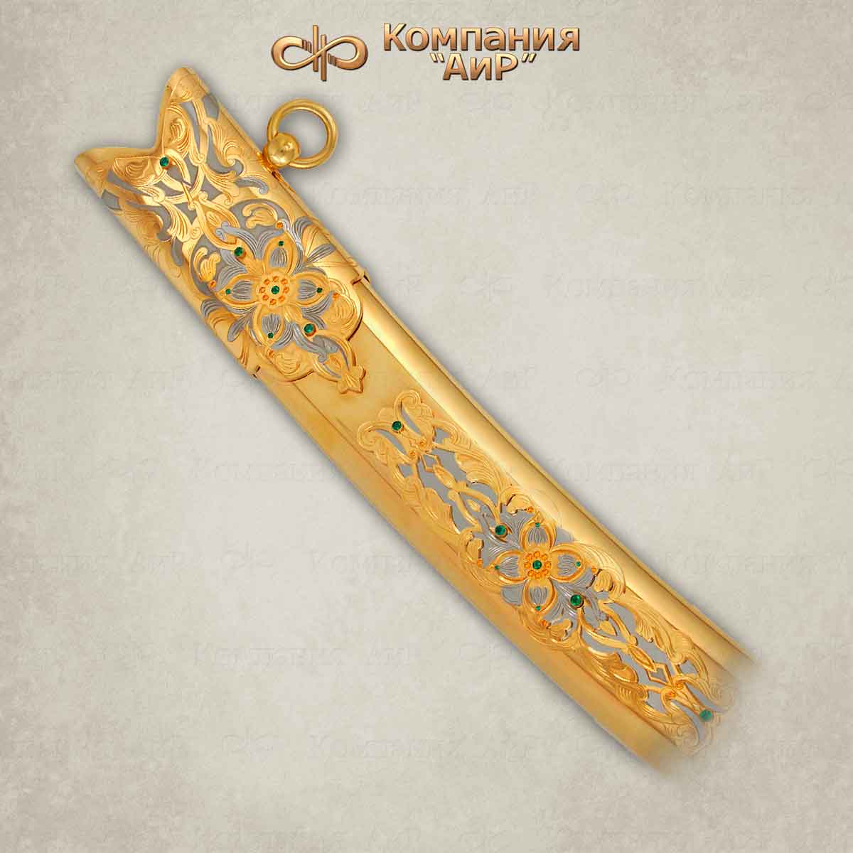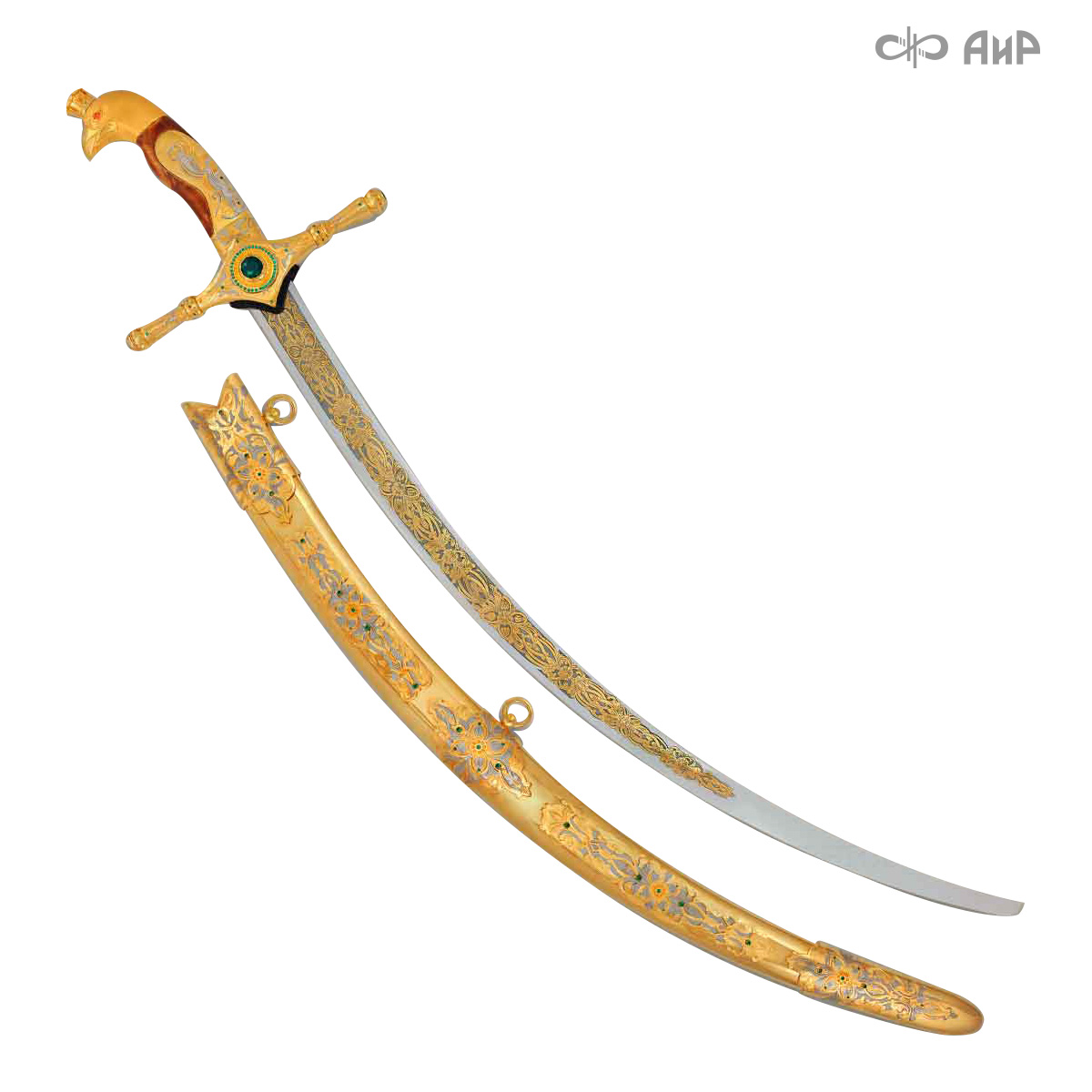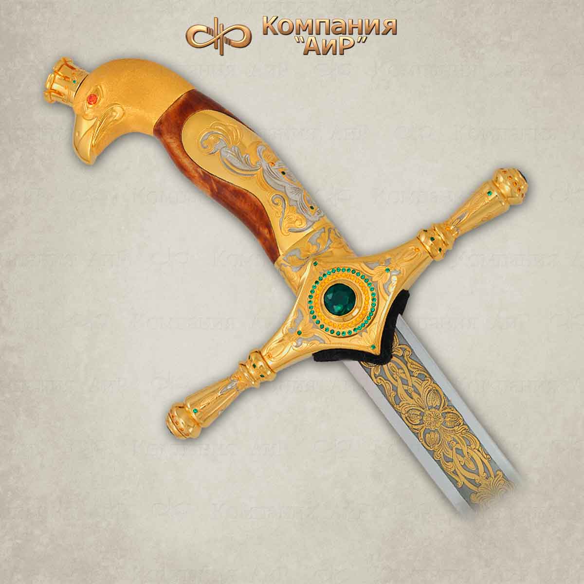 Изделие выполнено в стиле традиционного клинкового оружия Востока и украшено в духе златоустовской гравюры на металле. Эфес сабли представляет собой композицию, состоящую из ромбовидного перекрытия, украшенного ювелирными камнями и навершия в виде головы сокола с вставкой из березового капа. На клинке с лицевой и обратной сторон нанесен декоративный орнамент в восточном стиле, выполненный методом гальванизации золота высшей пробы. Цельнометаллические ножны сабли состоят из крышки, обоймицы и наконечника. Они также богато украшены золочеными узорами и гравировкой.