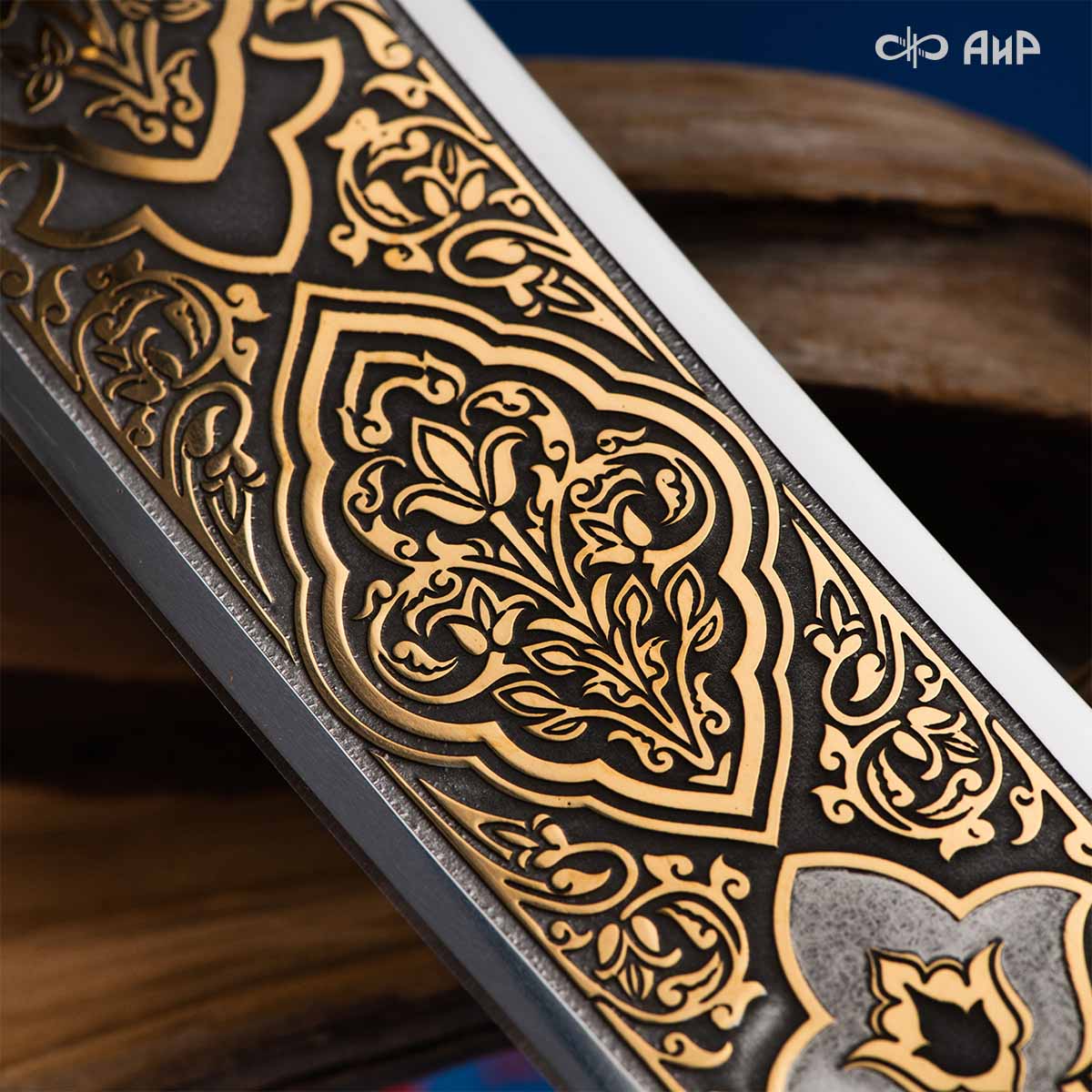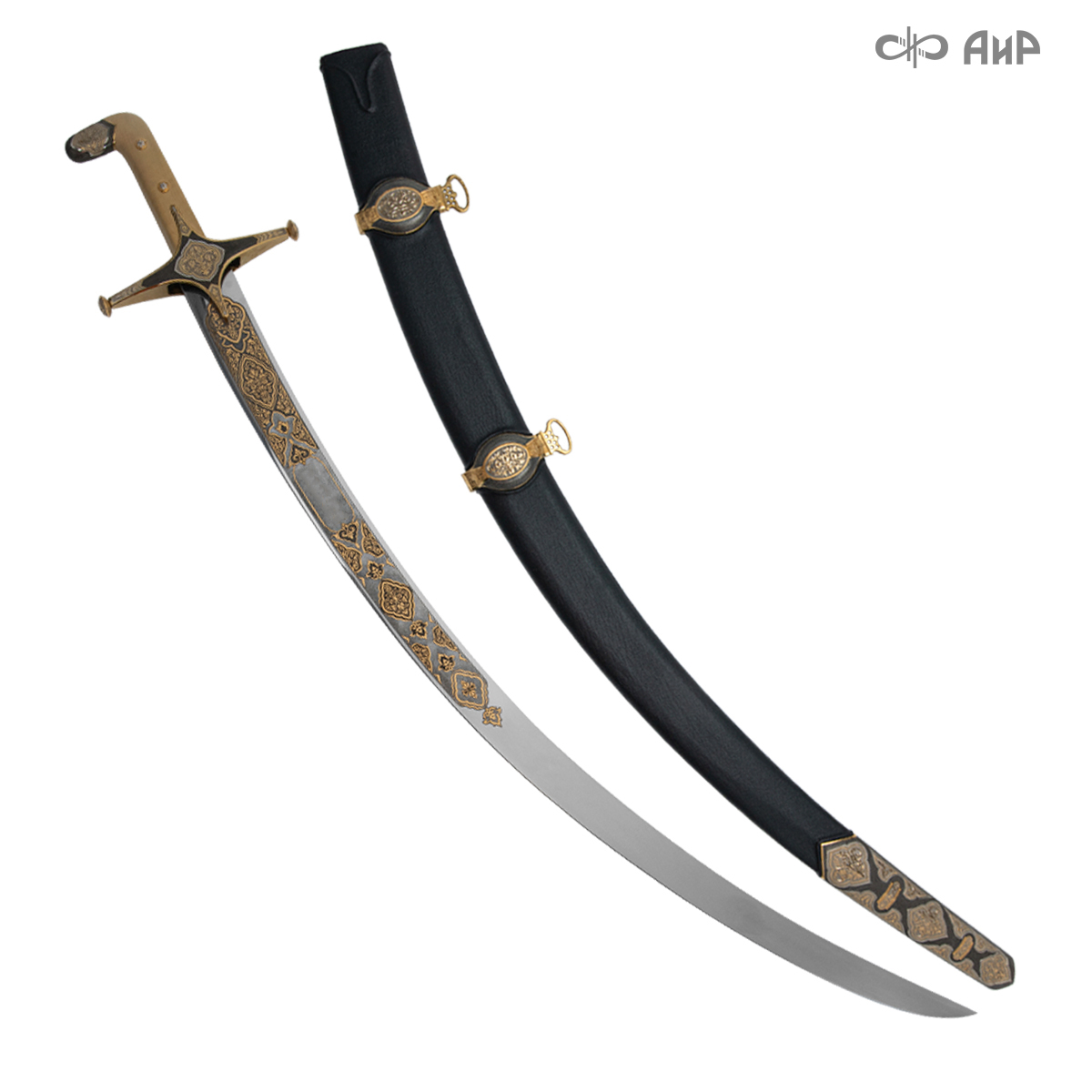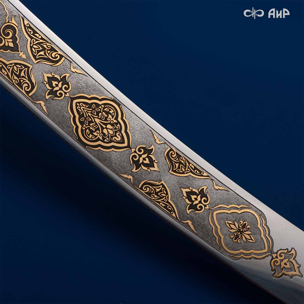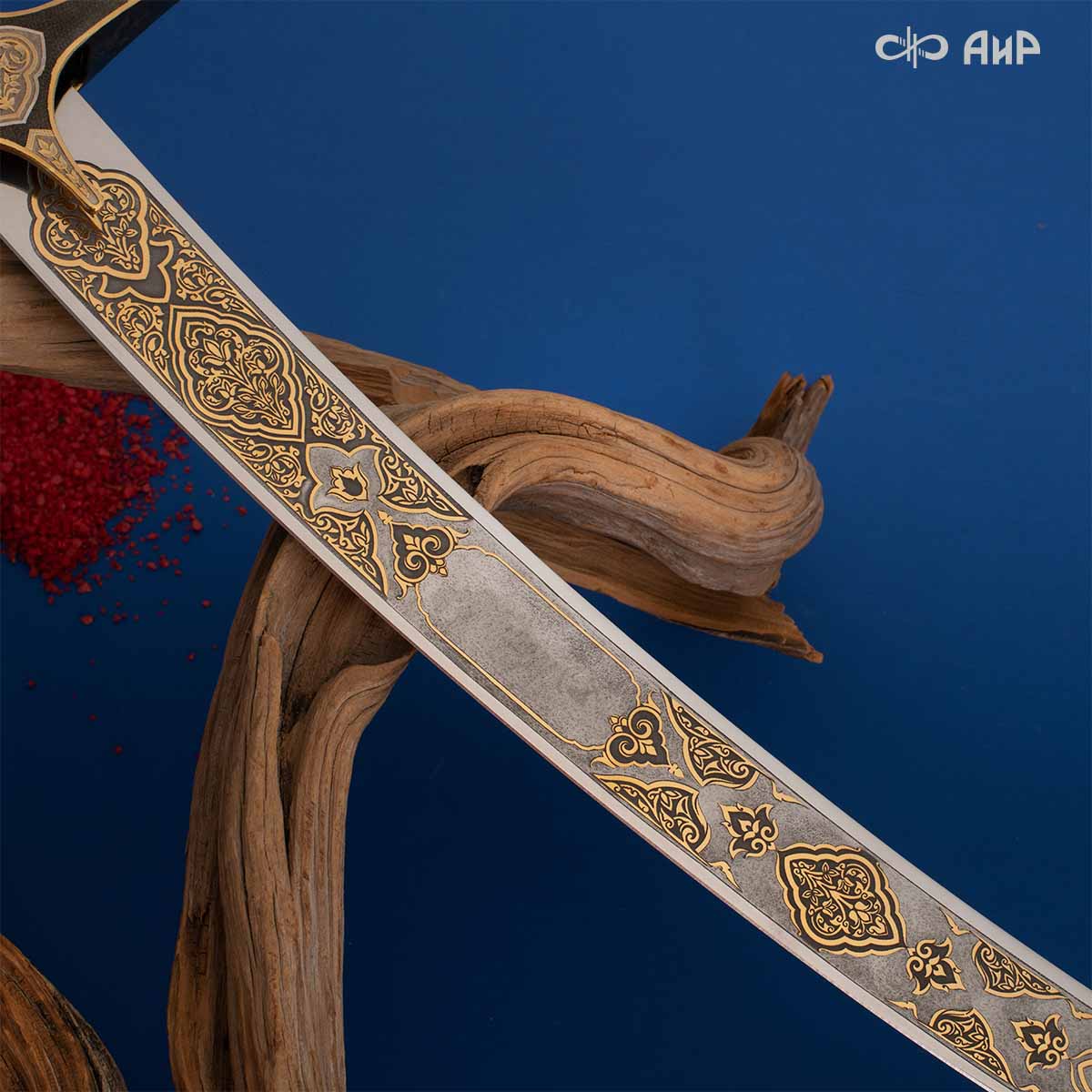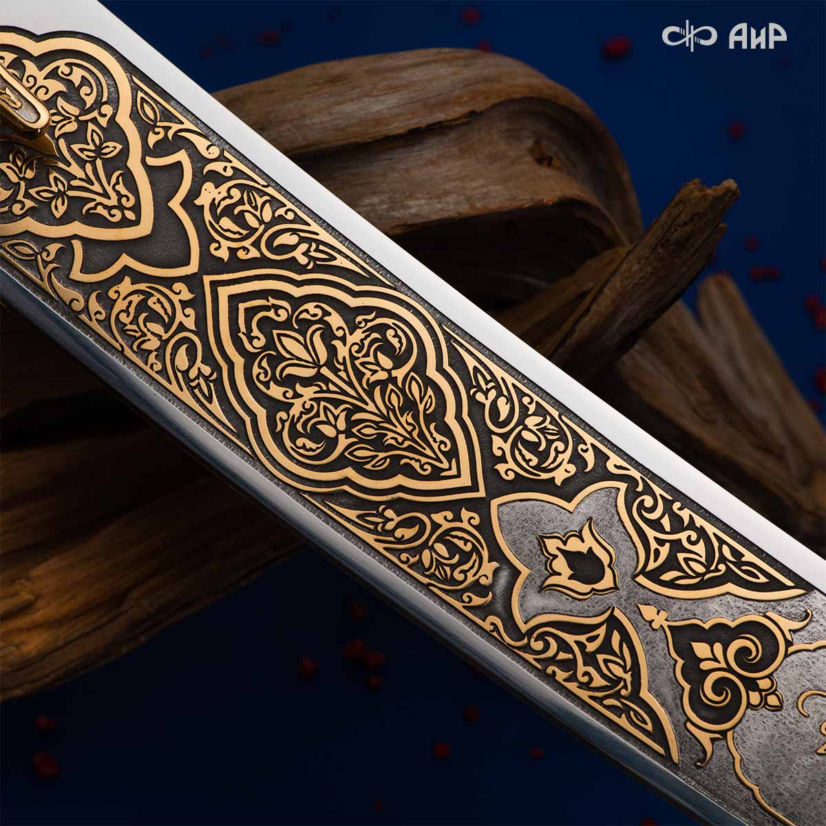 Сабля "Восточная", изготовленная мастерами Компании «АиР», представляет собой сувенирное длинноклинковое оружие, украшенное в стиле златоустовской гравюры на металле.