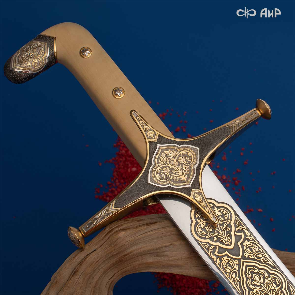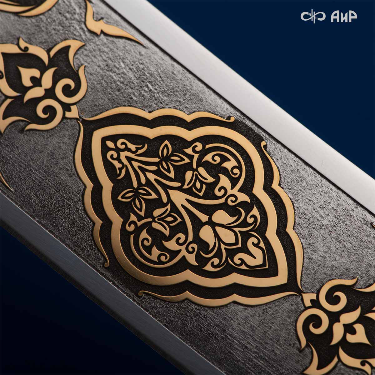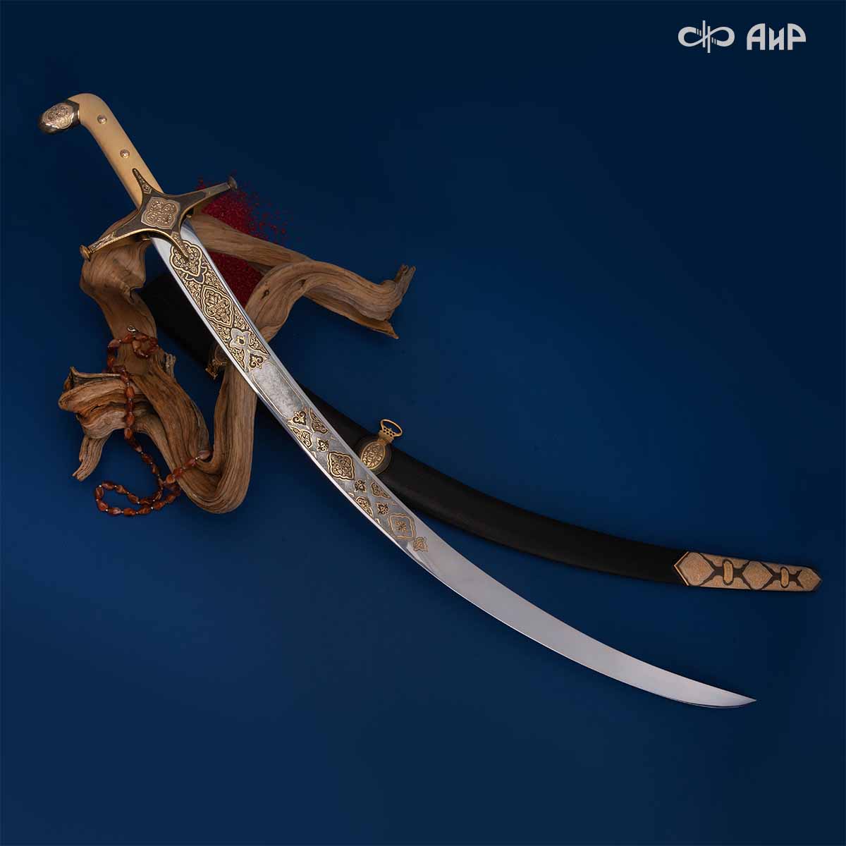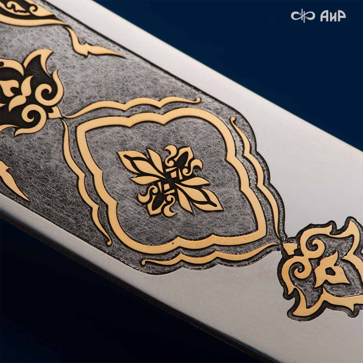 Сабля "Восточная", изготовленная мастерами Компании «АиР», представляет собой сувенирное длинноклинковое оружие, украшенное в стиле златоустовской гравюры на металле.