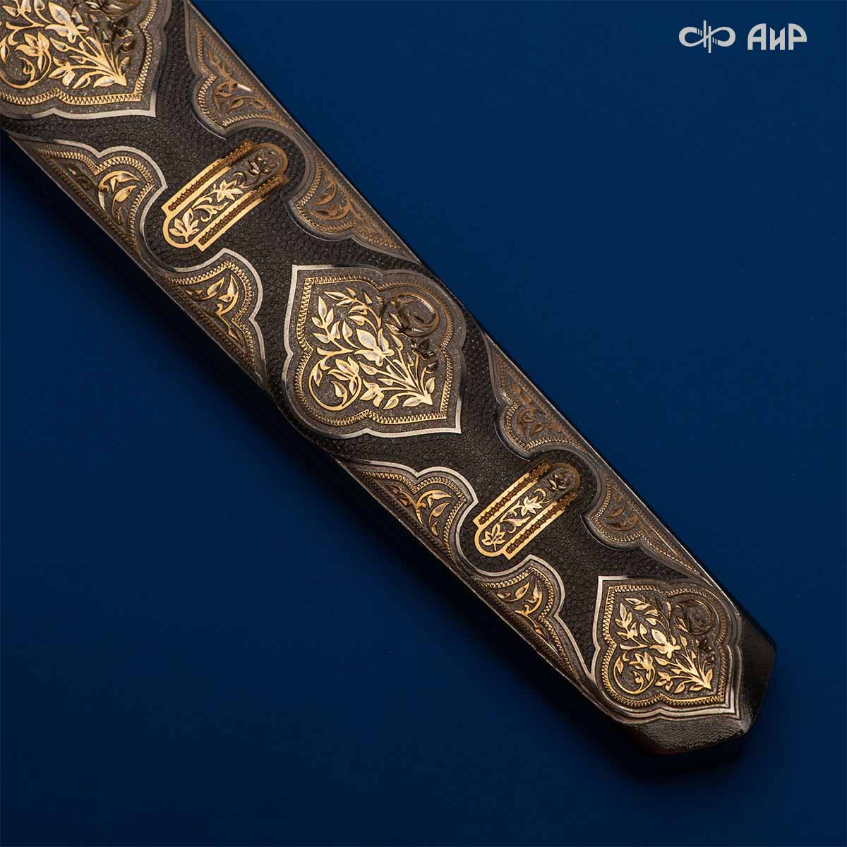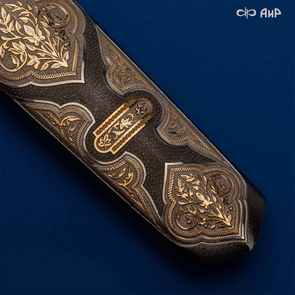 Ножны сабли изготовлены из дерева, обтянуты темно-зеленой кожей, они имеют такой изгиб, чтобы свободно размещать искривленный клинок в ножнах. Устье, наконечник и обоймица ножен также изящно украшены восточным и растительным орнаментом, поверхность декоративных элементов обработана в технике шабрения, что придает всему изделию вид дорогой и старинной сабли.