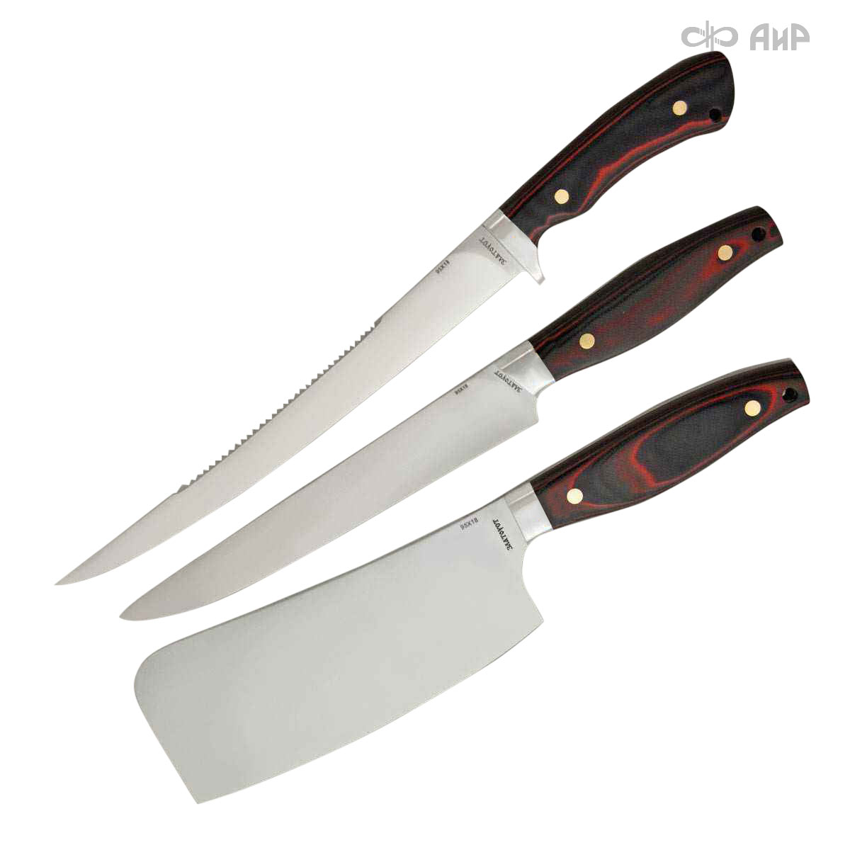 В набор «Таймень» входят: филейный нож «Мастер-Фиш» (374(250)х28х1,8 мм), нож «Разделочный» (324(194)х33х3,0 мм) и топорик «Секач» (299(173)х70х6,0 мм).