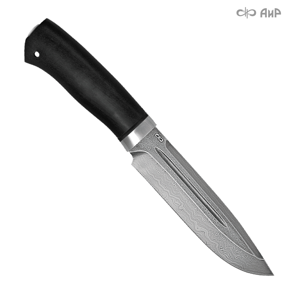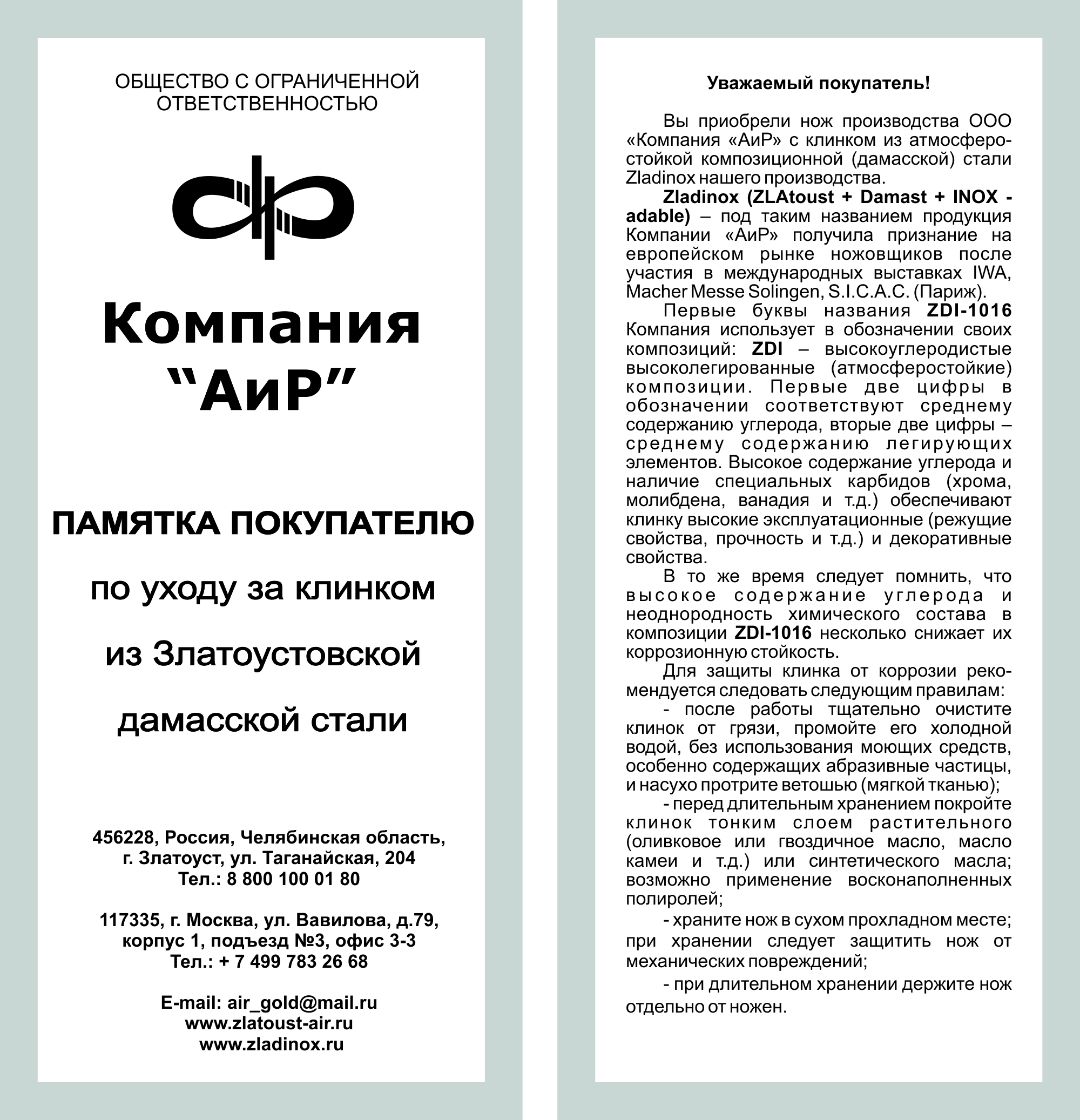 Клинок из атмосферостойкой композиционной (дамасской) стали Zladinox нашего производства. Zladinox (ZLAtoust + Damast + INOX - adable) – под таким названием продукция Компании «АиР» получила признание на европейском рынке ножовщиков после участия в международных выставках IWA, Macher Messe Solingen, S.I.C.A.C. (Париж).
