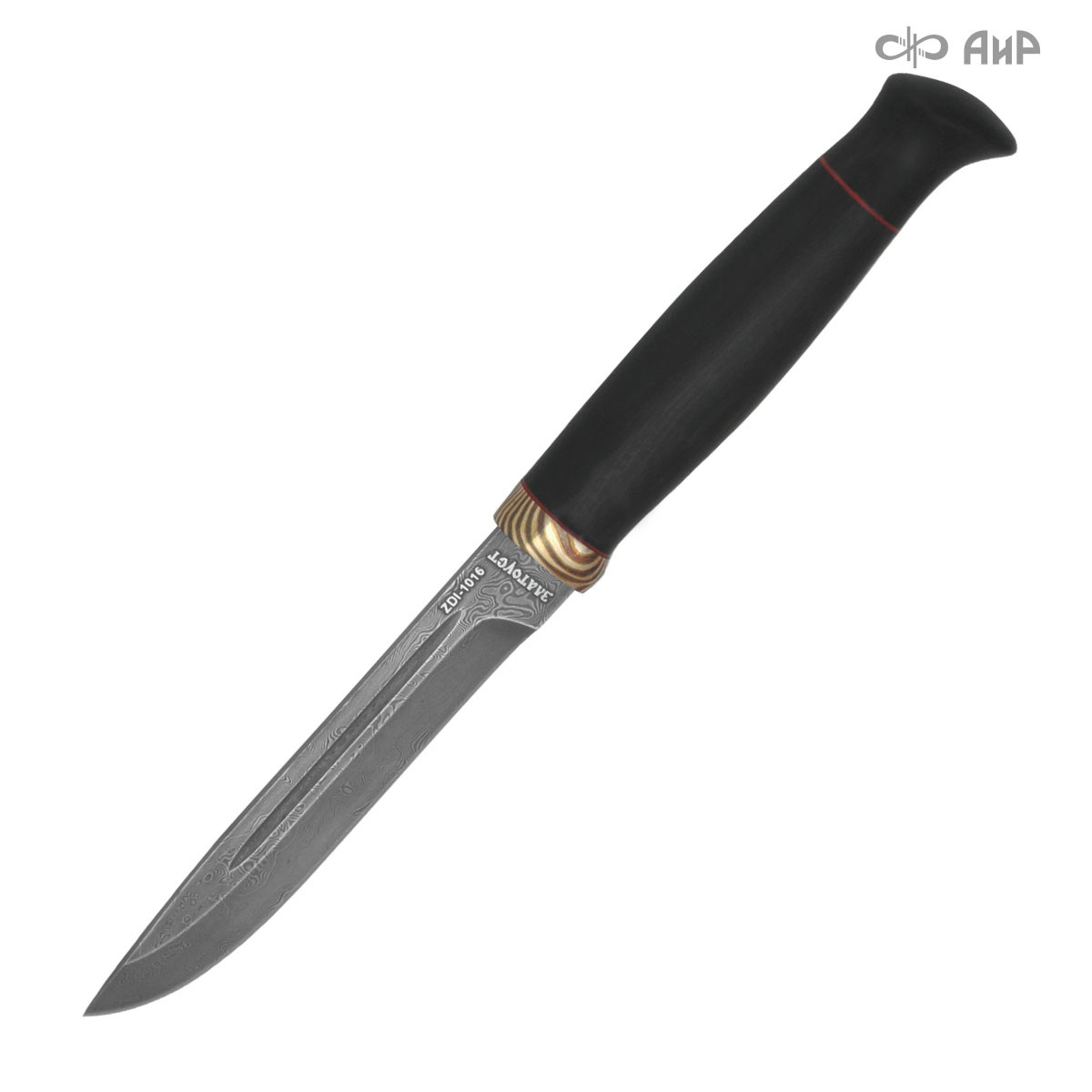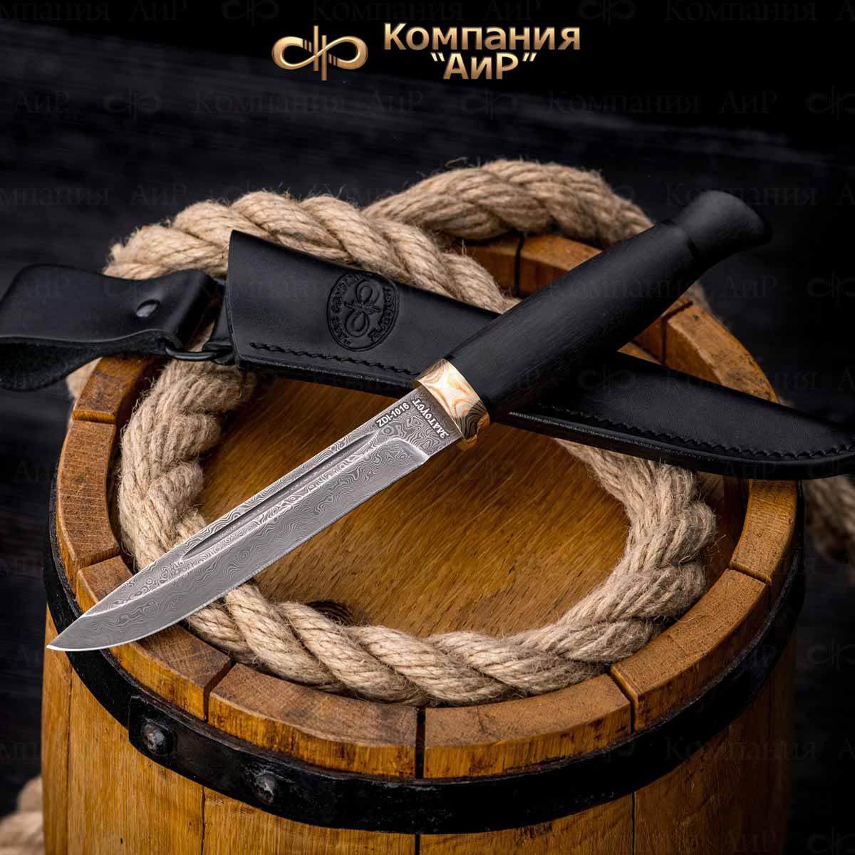 Клинок из атмосферостойкой композиционной (дамасской) стали Zladinox нашего производства. Гарда выполнена из цветного дамаска мокуме гане. Zladinox (ZLAtoust + Damast + INOX - adable) – под таким названием продукция Компании «АиР» получила признание на европейском рынке ножовщиков после участия в международных выставках IWA, Macher Messe Solingen, S.I.C.A.C. (Париж).