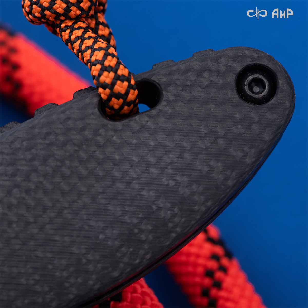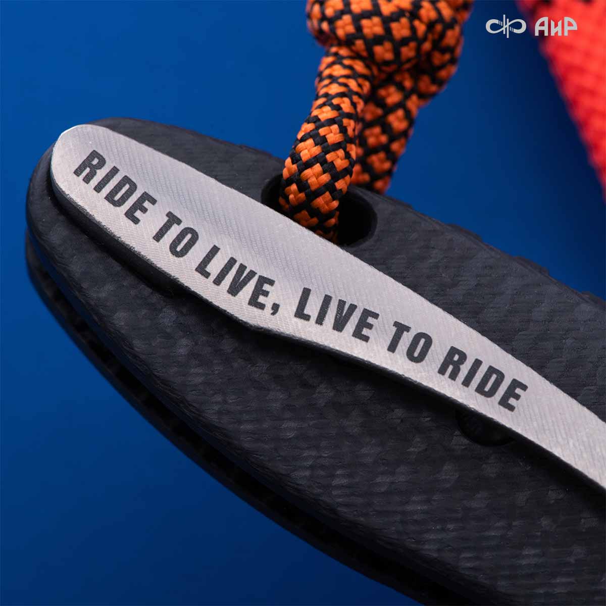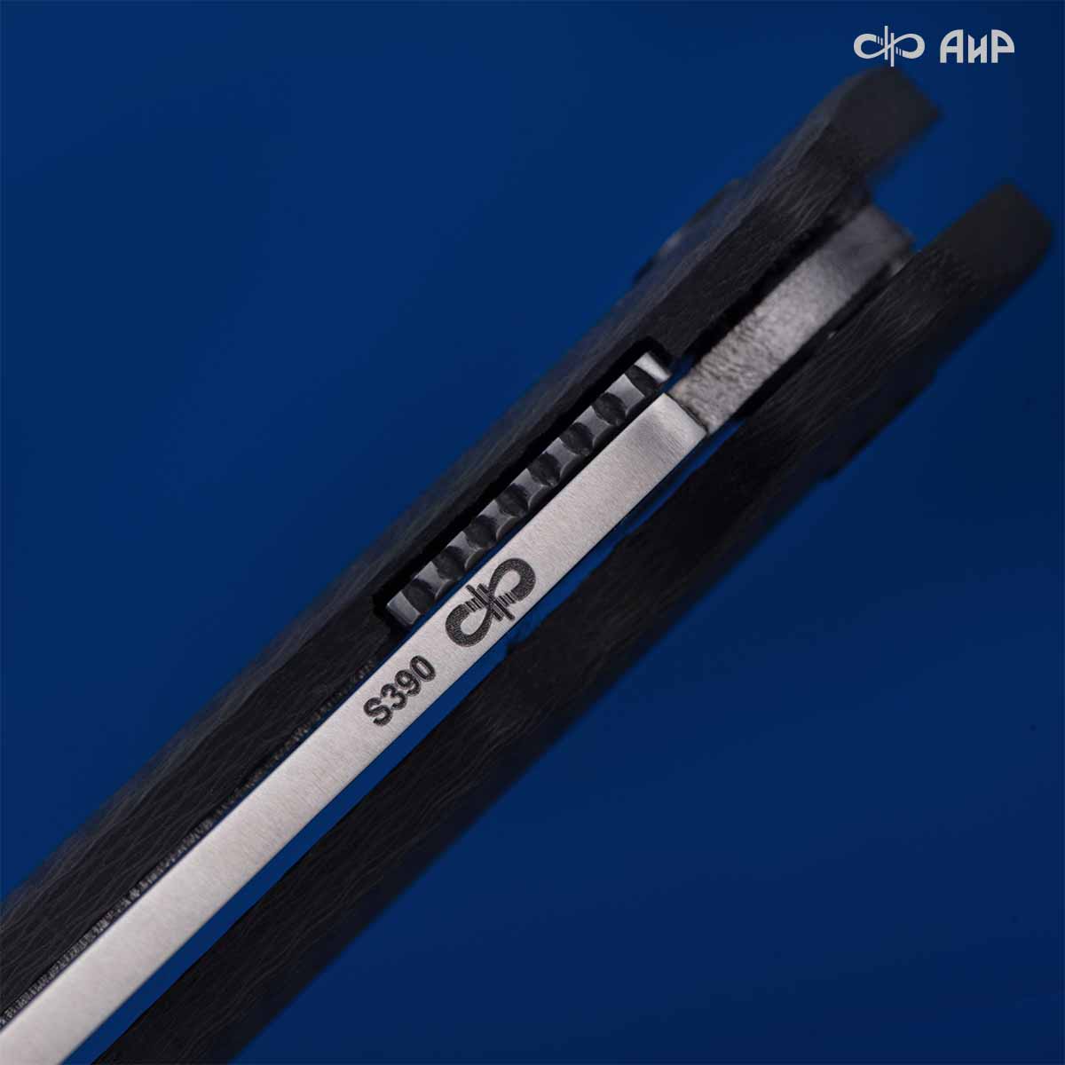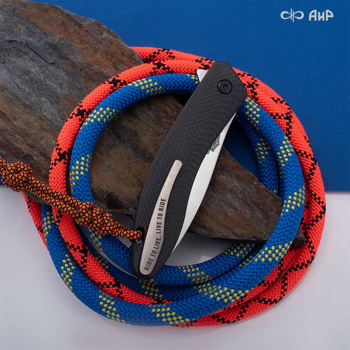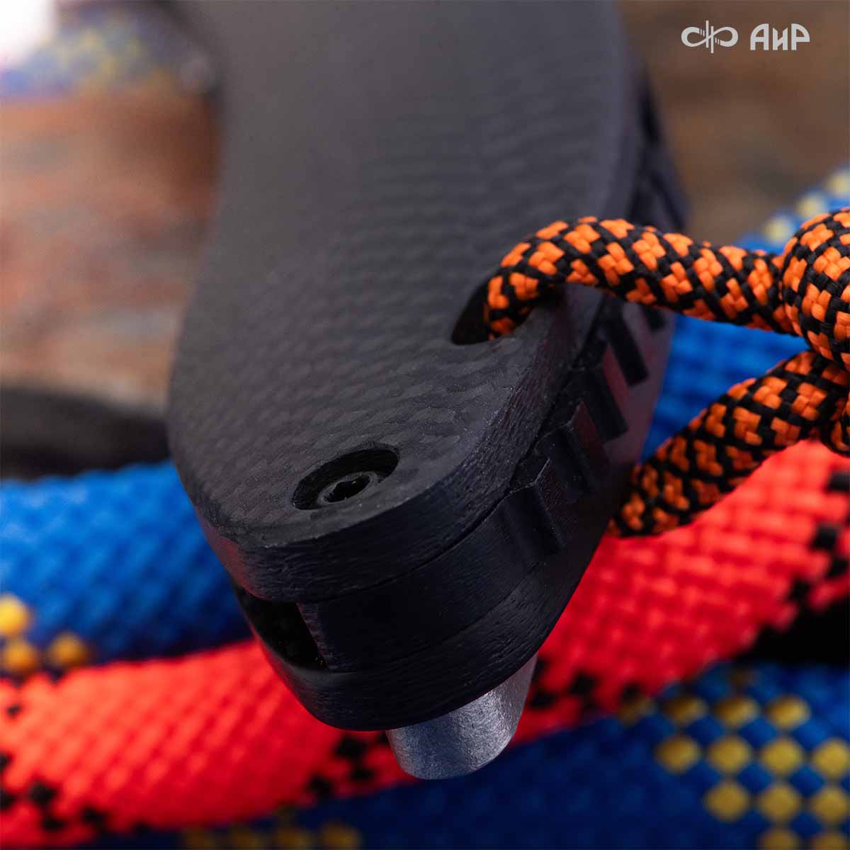 «Хантер» оснащен титановой клипсой для крепления ножа на кармане или поясе. Так нож всегда будет под рукой и не потеряется во время активных действий. Фрезеровка на клипсе дополняет эстетичный образ ножа. Кроме того, для уверенного удержания ножа и как элемент дизайна служит бэкспейсер (так называемая «спинка»), который закрывает все внутренности ножа и режущую кромку.
