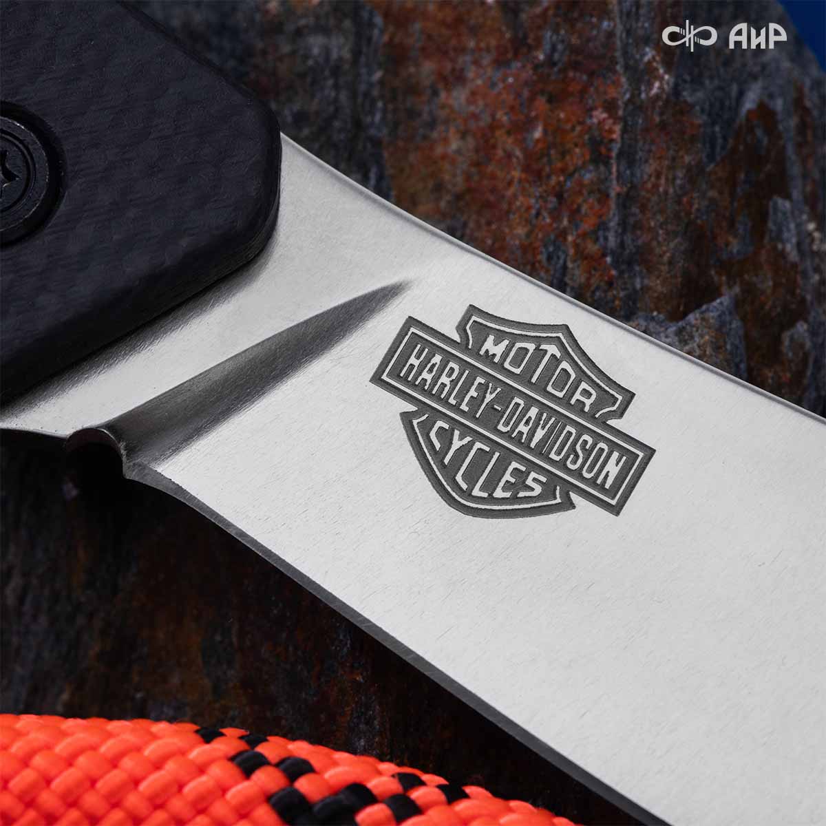 Форму клинка «Хантер» унаследовал от «Канадского малого (траппера)» – каплевидный клинок с прямыми спусками от обуха, который демонстрирует эффективность как в резе, так и в уколе. Клинок из нержавеющей стали стандартно выполняется с полировкой «сатин». Примечательно, что логотип производителя и марка стали нанесены на обух ножа, они видны даже в закрытом положении.