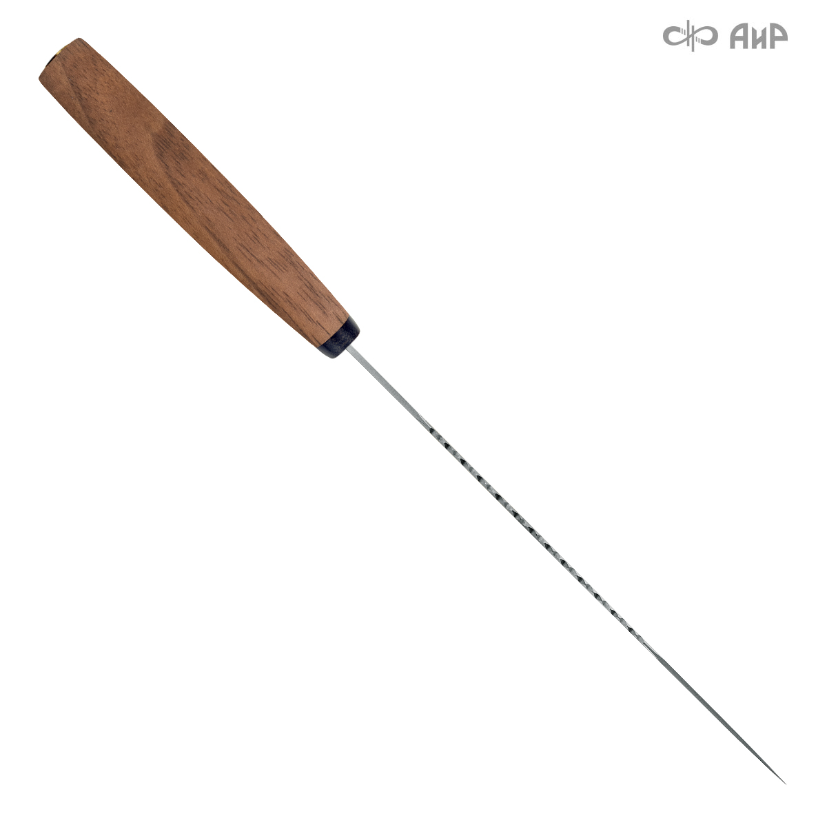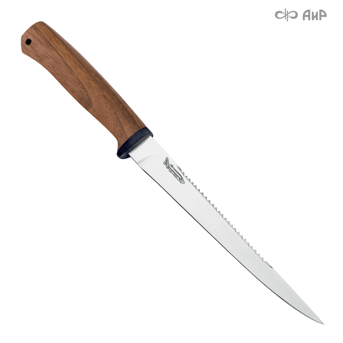 Большой разделочный нож для крупной рыбы с узким клинком и пилообразной заточкой на обухе для чистки чешуи. Клинок толщиной 2 мм имеет прямые спуски, образующие тонкое, прекрасно режущее лезвие. Классическая форма рукояти уверенно и прочно лежит в любой ладони. А оптимальной величины гарда не дает соскользнуть пальцам при резах от себя. Монтаж рукояти сквозной, неразборный. Отличный выбор для разделки крупной рыбы.
