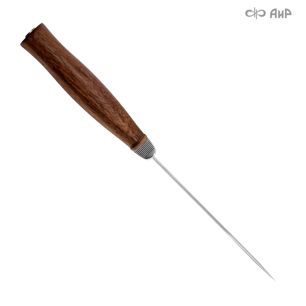 Универсальный, очень легкий нож средней величины с развитой стальной гардой классического типа. Нож прекрасно сбалансирован. Неширокий клинок толщиной 2,6 мм, с обушком популярной формы «лещиком», имеет вогнутые линзовидные спуски на половину ширины клинка, образующие прекрасно режущее лезвие. На голомени с обеих сторон клинка выбраны узкие долы, добавляющие жесткости клинку. Небольшая эргономичная рукоять на удивление хорошо ложится даже в большую ладонь. А расширенная головка рукояти хорошо способствует этому. Монтаж клинка сквозной, неразборный. Прототипом ножа является «Нож разведчика» образца 1940 г. Заслуженно пользуется популярностью у широкого круга покупателей.