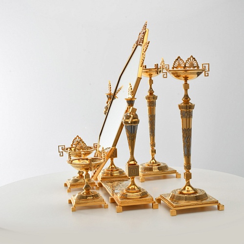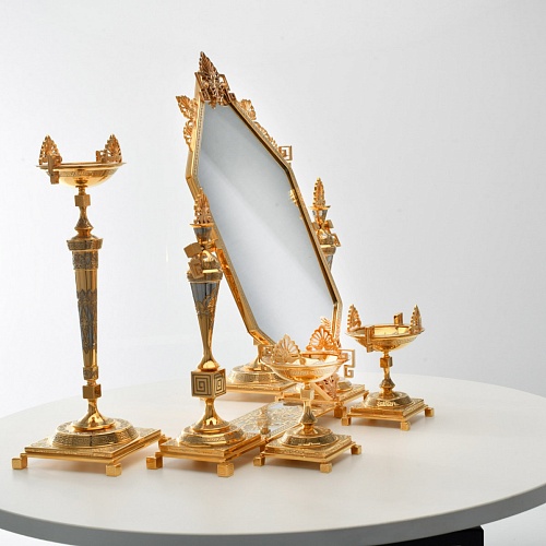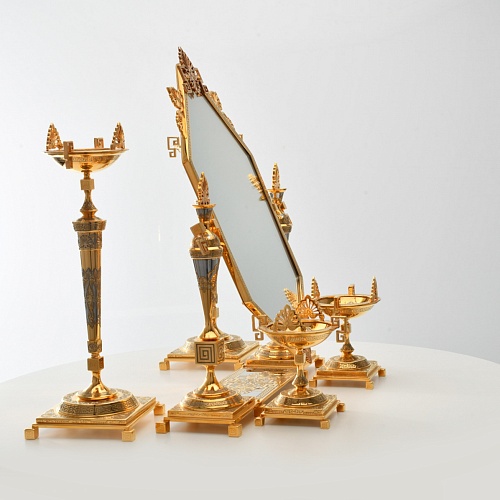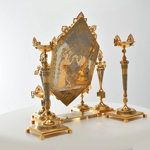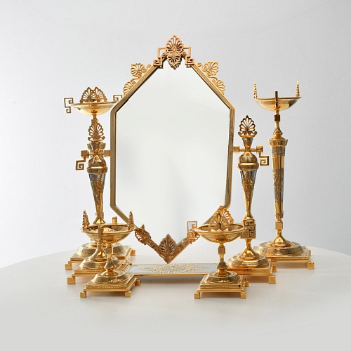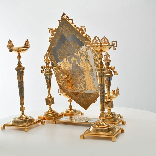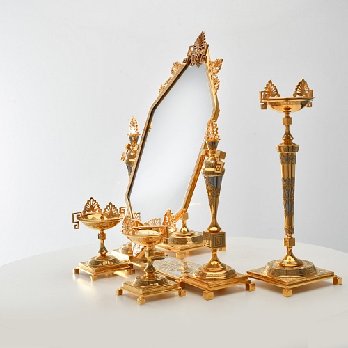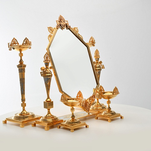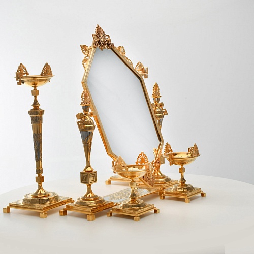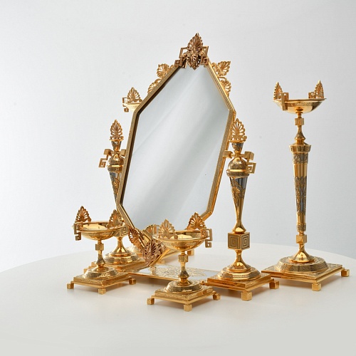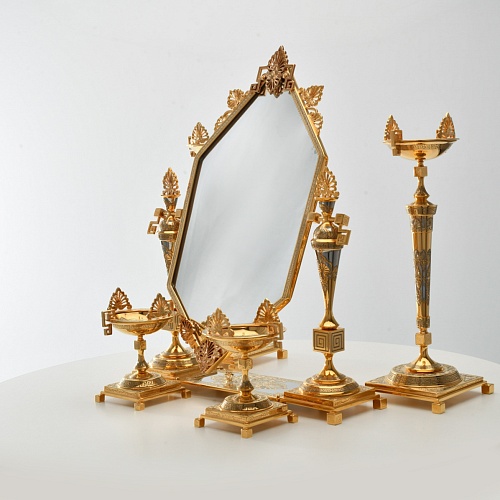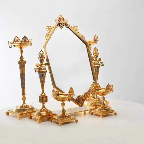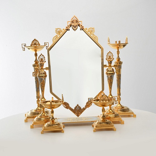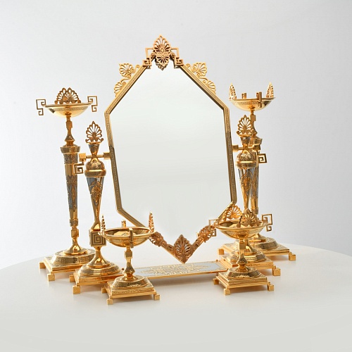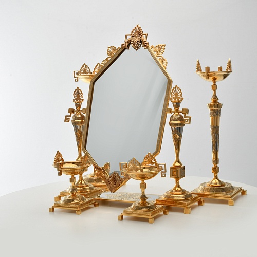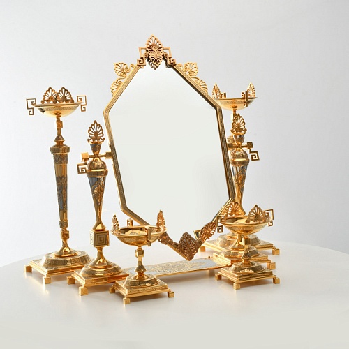 Изящный набор из настольного зеркала и четырех подсвечников – прекрасный подарок для дамы сердца, он непременно украсит туалетный столик женщины и еще лучше подчеркнет ее достоинство и красоту.