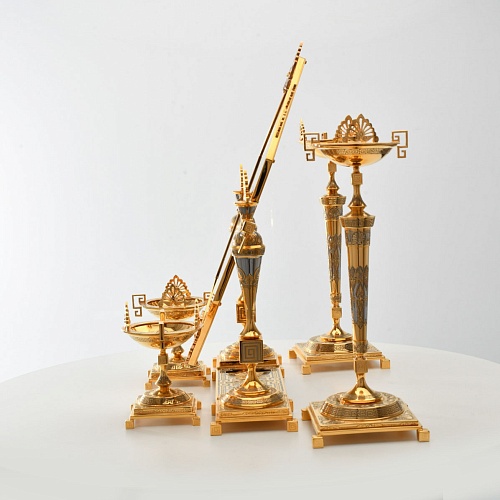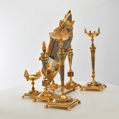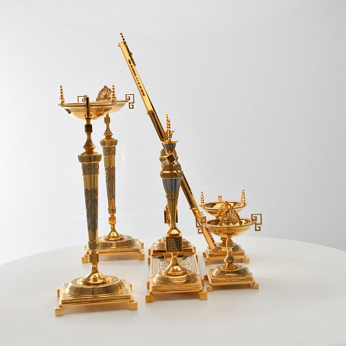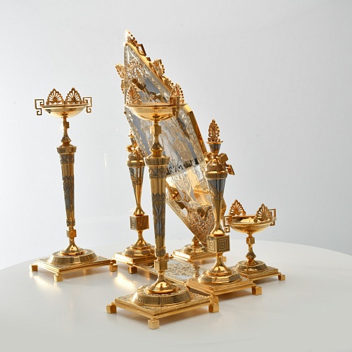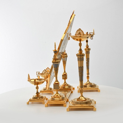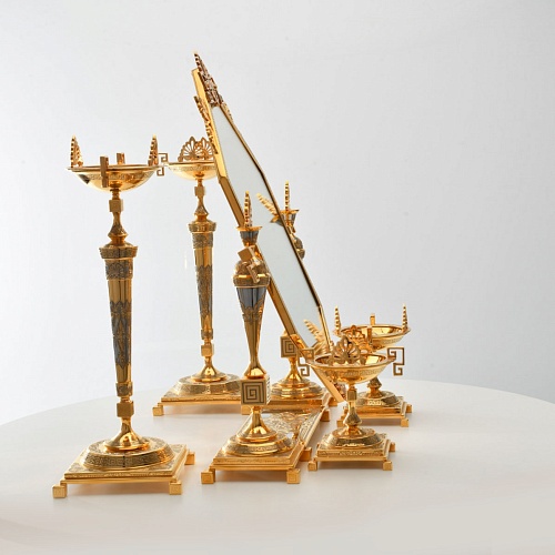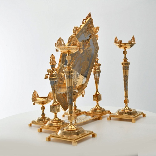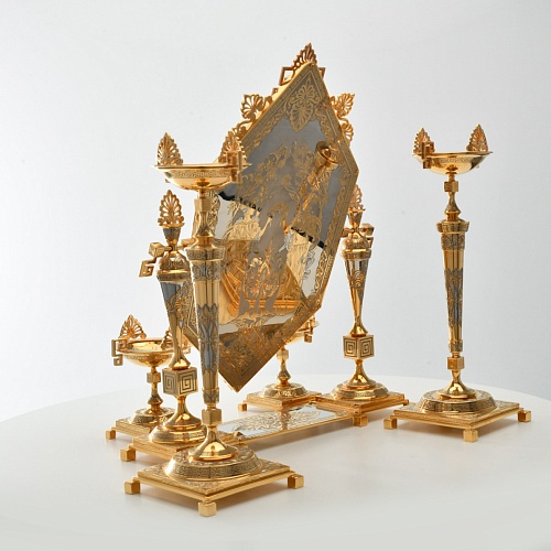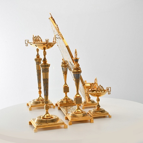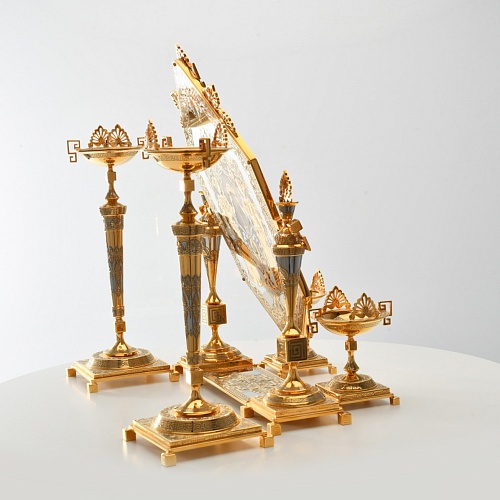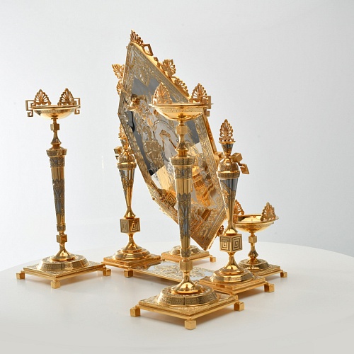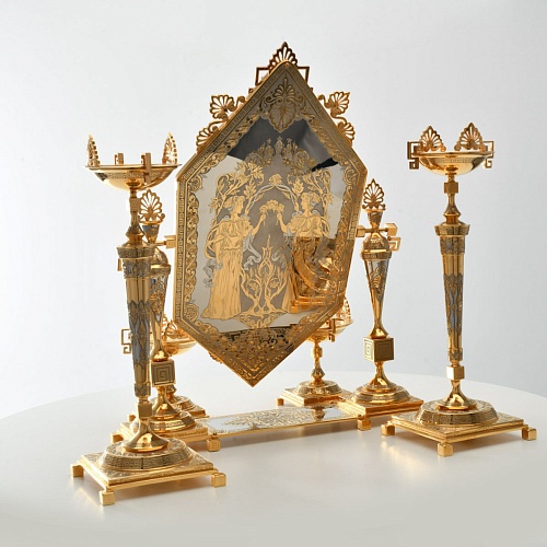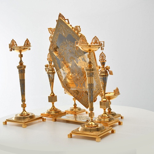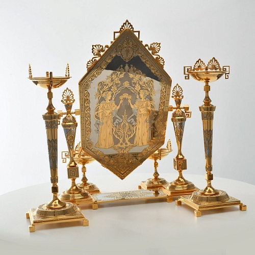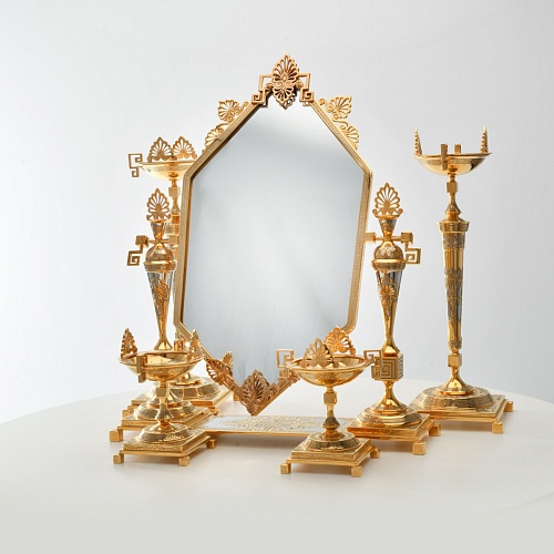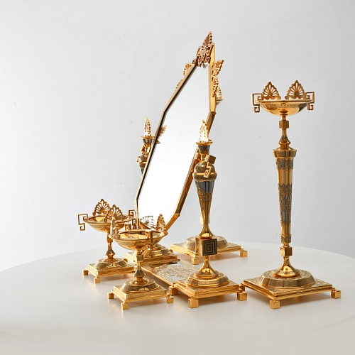 Изящный набор из настольного зеркала и четырех подсвечников – прекрасный подарок для дамы сердца, он непременно украсит туалетный столик женщины и еще лучше подчеркнет ее достоинство и красоту.