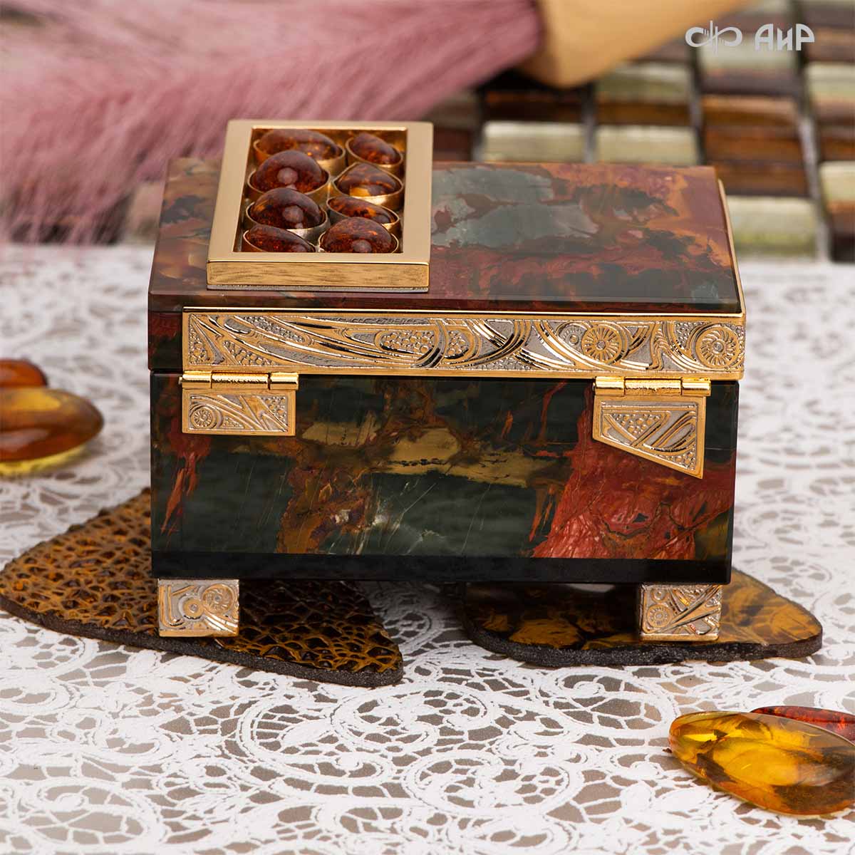 Шкатулка Энергия солнца из яшмы Пикассо и янтаря, Артикул: 38712