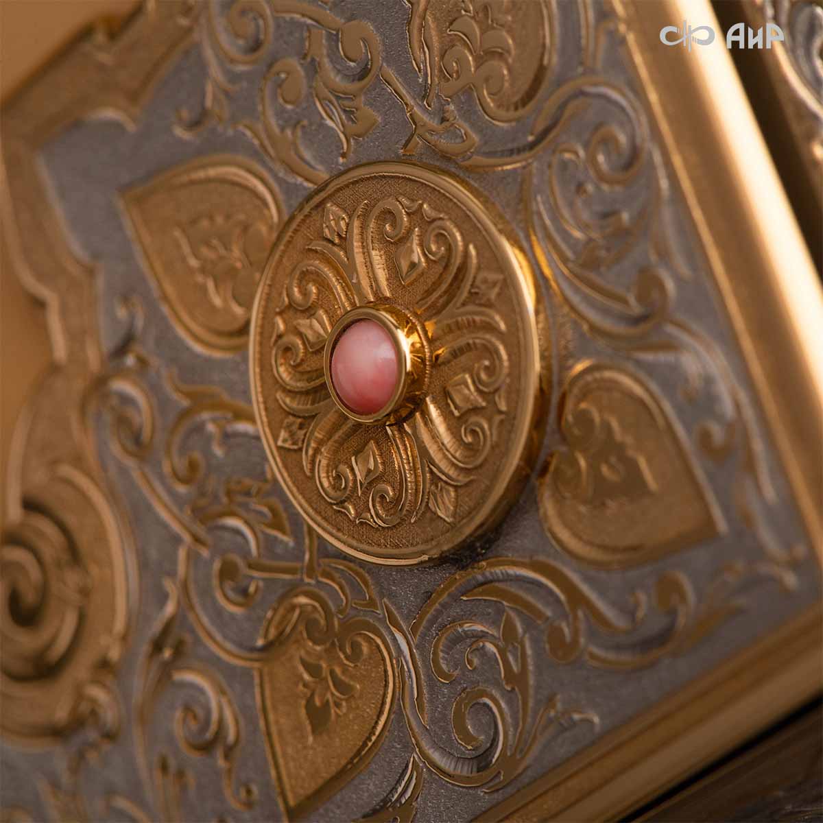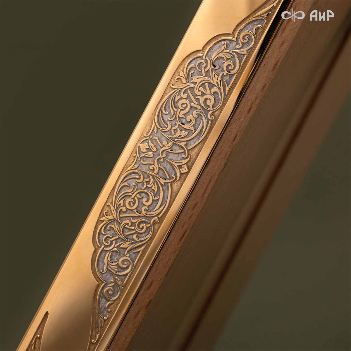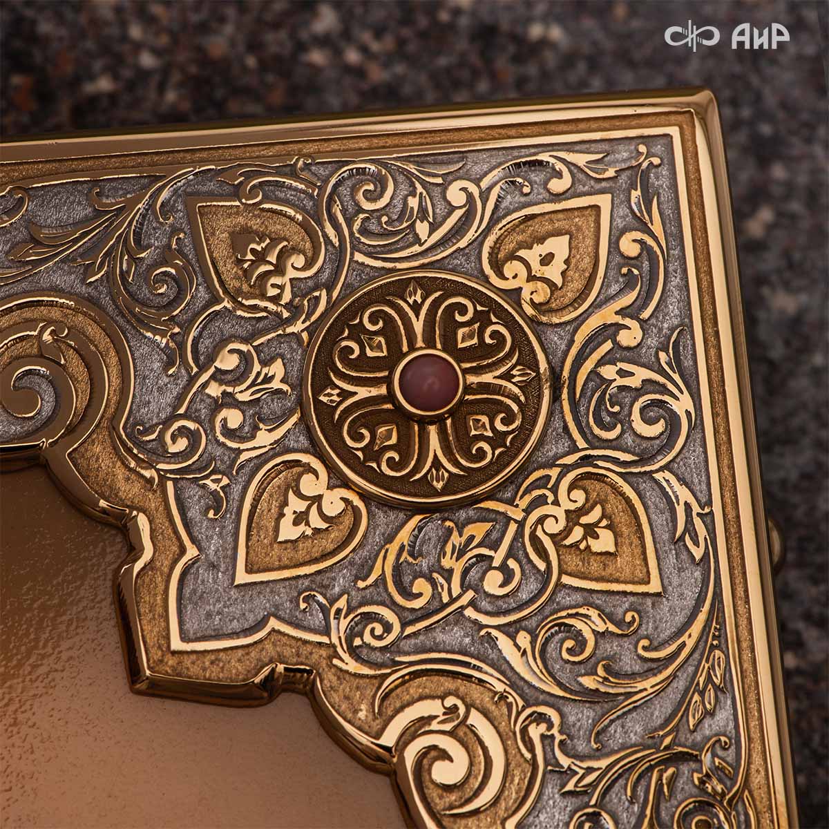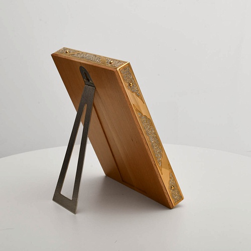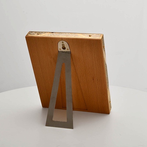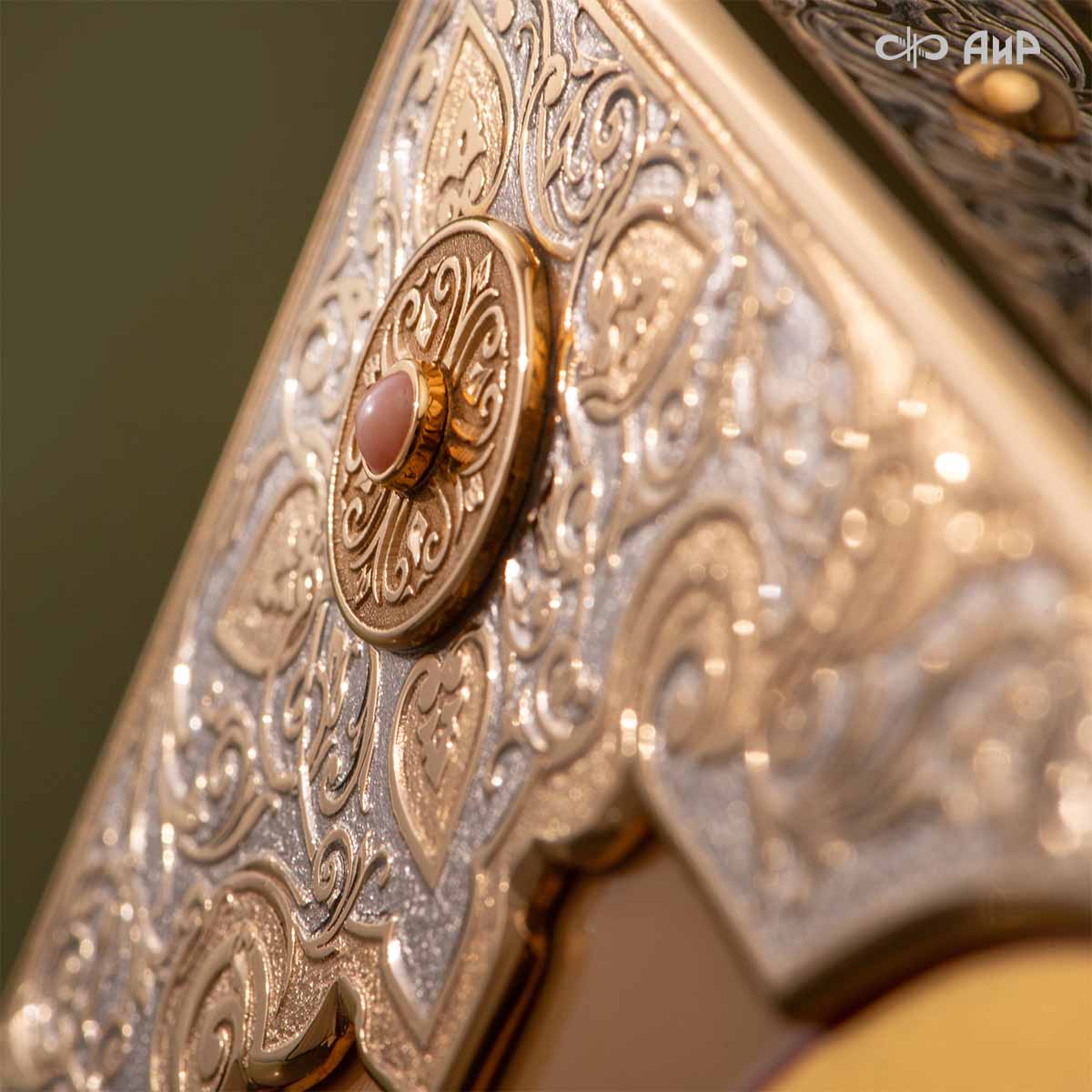 Как когда-то в Древней Руси церкви строились без единого гвоздя, так и в этом изделии мастера Компании «АиР» применили техническую смекалку. Оклад из желтого металла собран без единого сварного шва, детали бережно подогнаны друг к другу и создают цельную композицию.