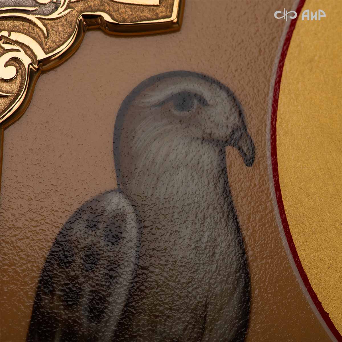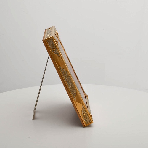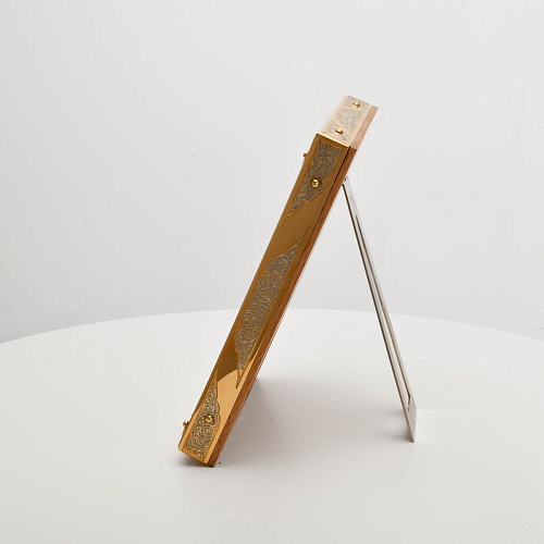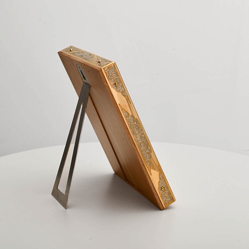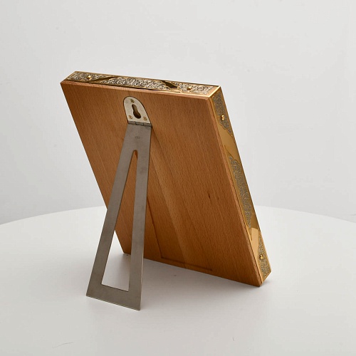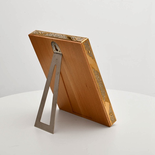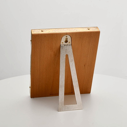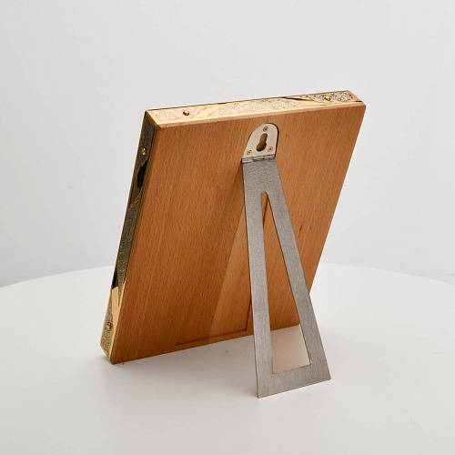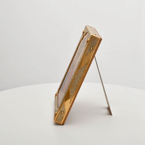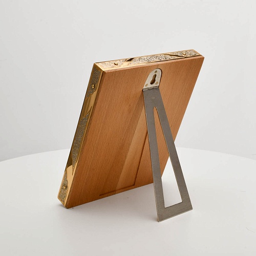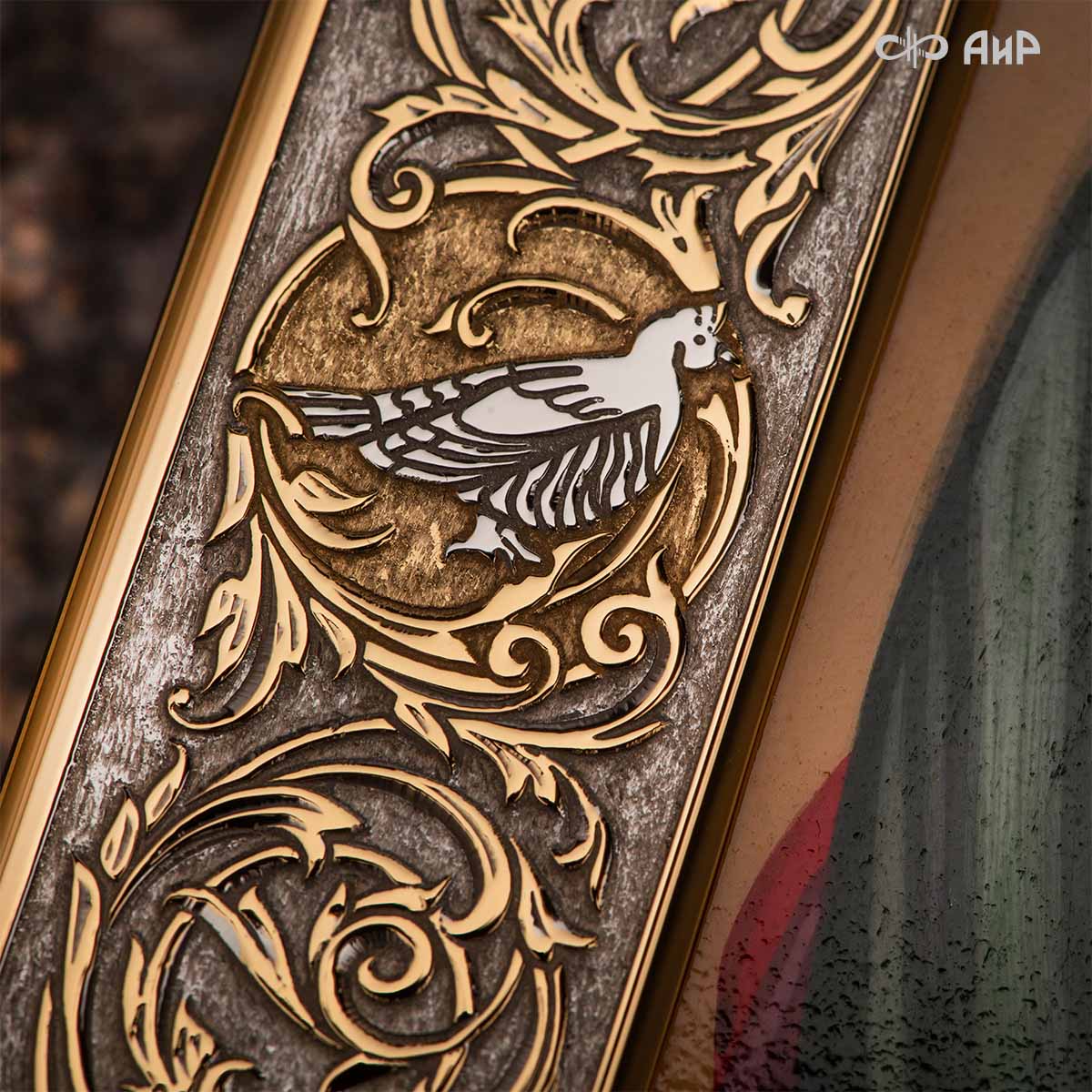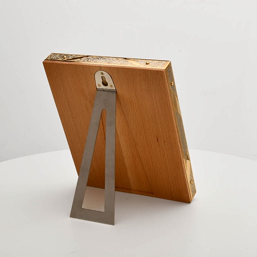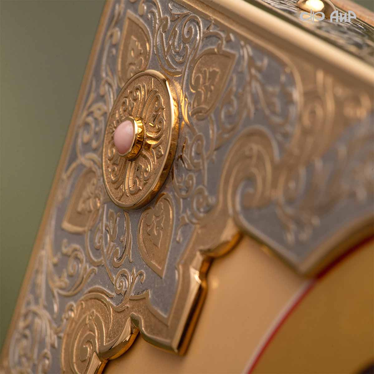 Как когда-то в Древней Руси церкви строились без единого гвоздя, так и в этом изделии мастера Компании «АиР» применили техническую смекалку. Оклад из желтого металла собран без единого сварного шва, детали бережно подогнаны друг к другу и создают цельную композицию.