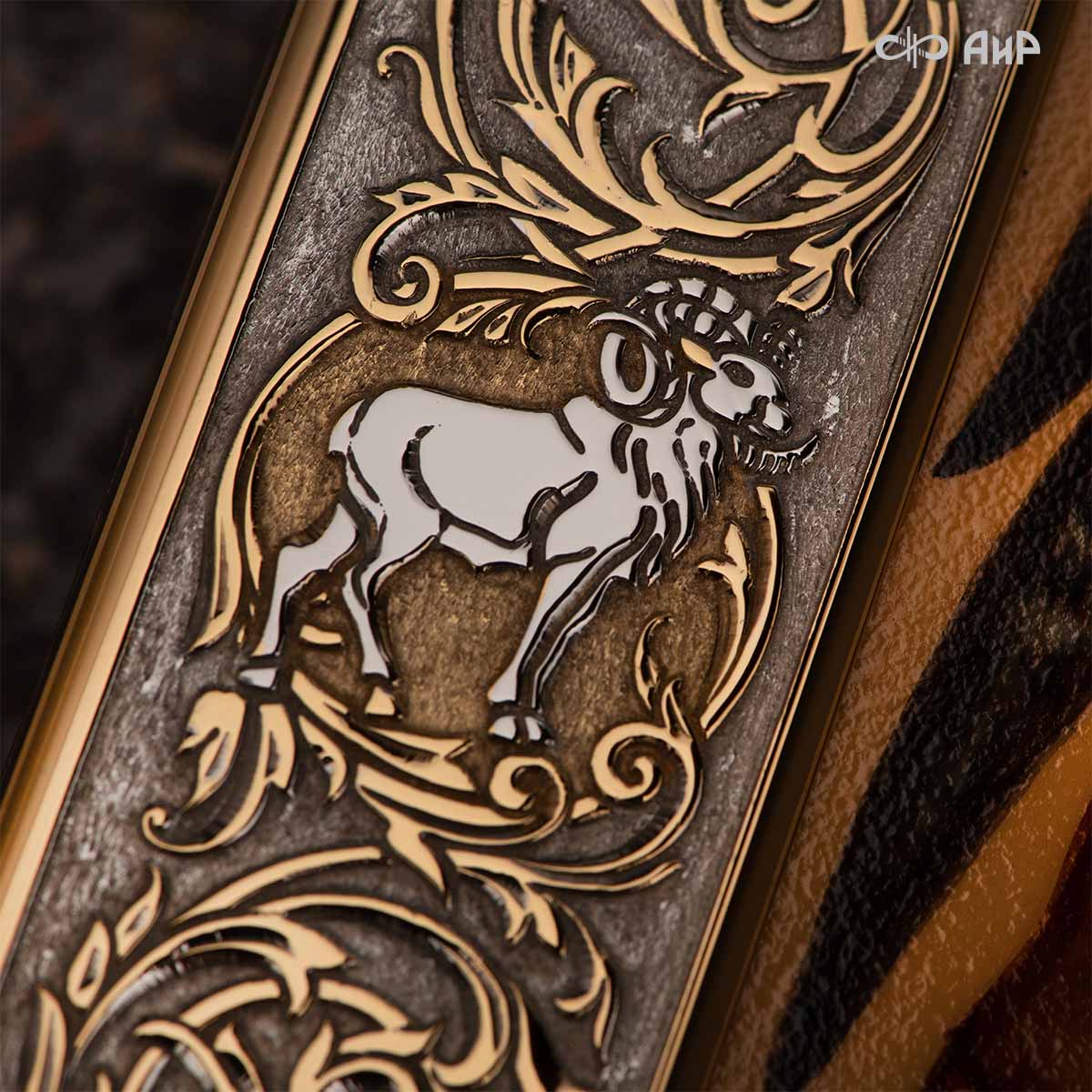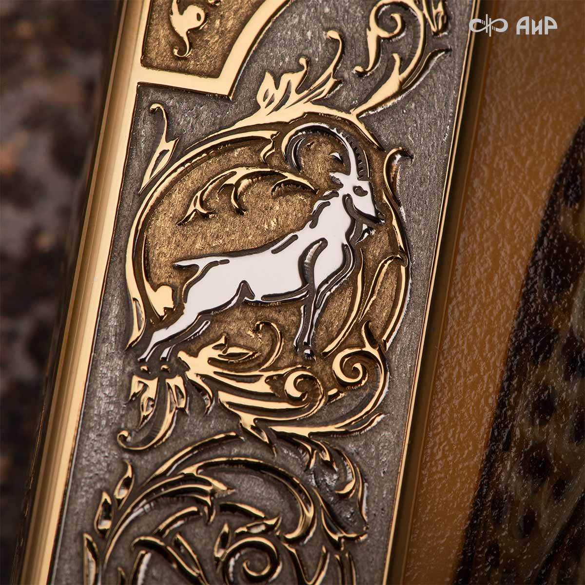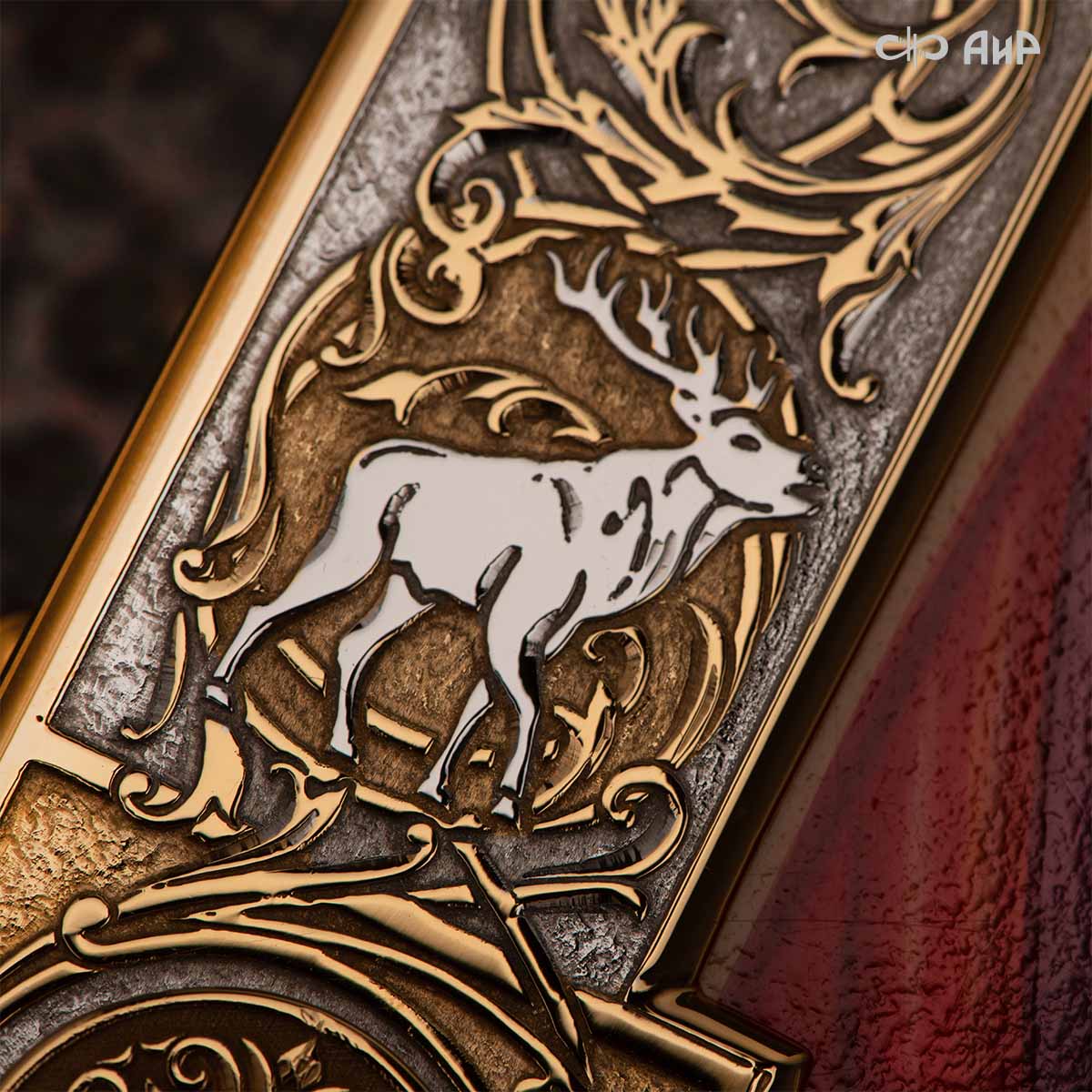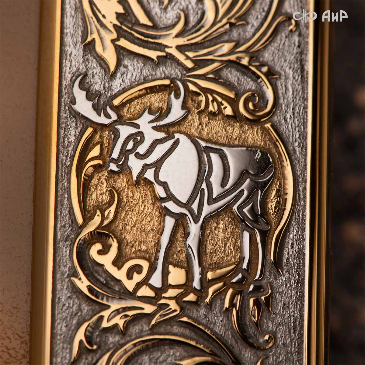 На окладе, выполненном в художественном стиле златоустовской гравюры на металле, в обрамлении древнерусских растительных орнаментов изображены несколько животных и птиц, связанных с охотой. Слева: горный козел, снежный баран, рябчик, лось; справа: глухарь, марал, тетерев, медведь.