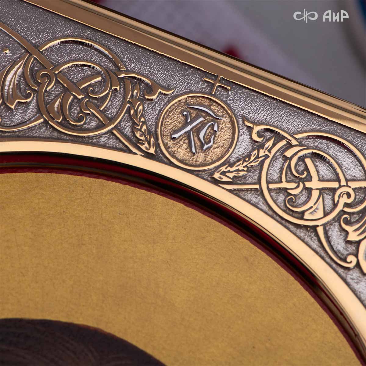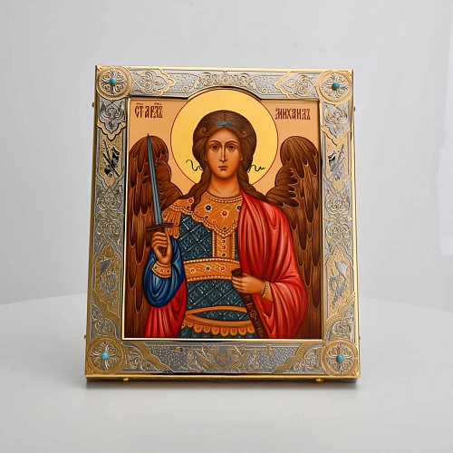 Оклад иконы «Архангел Михаил», выполненный мастерами компании «АиР» в г. Златоуст, придает ей особую ценность и торжественность. Оклад покрыт золотом высшей пробы (999,9°) толщиной в 1 микрон, что подчеркивает высокое мастерство и искусство создателей. Золотое покрытие не только украшает икону, но и символизирует вечность и непреходящую ценность духовного наследия. Оно защищает икону от внешних воздействий и придает ей дополнительное сияние, усиливая впечатление от образа святого. Такой оклад делает икону не только объектом религиозного почитания, но и произведением искусства, достойным восхищения и уважения.