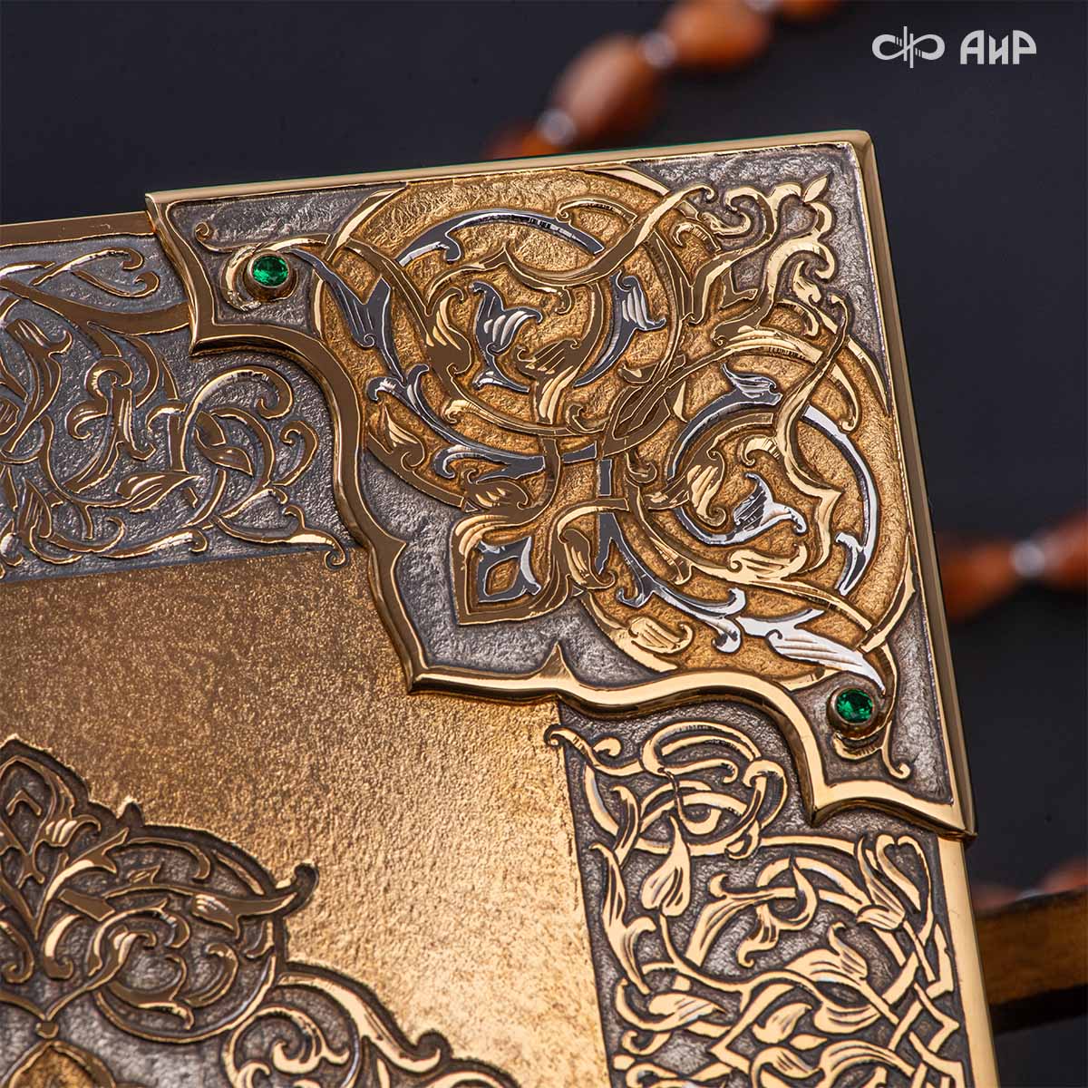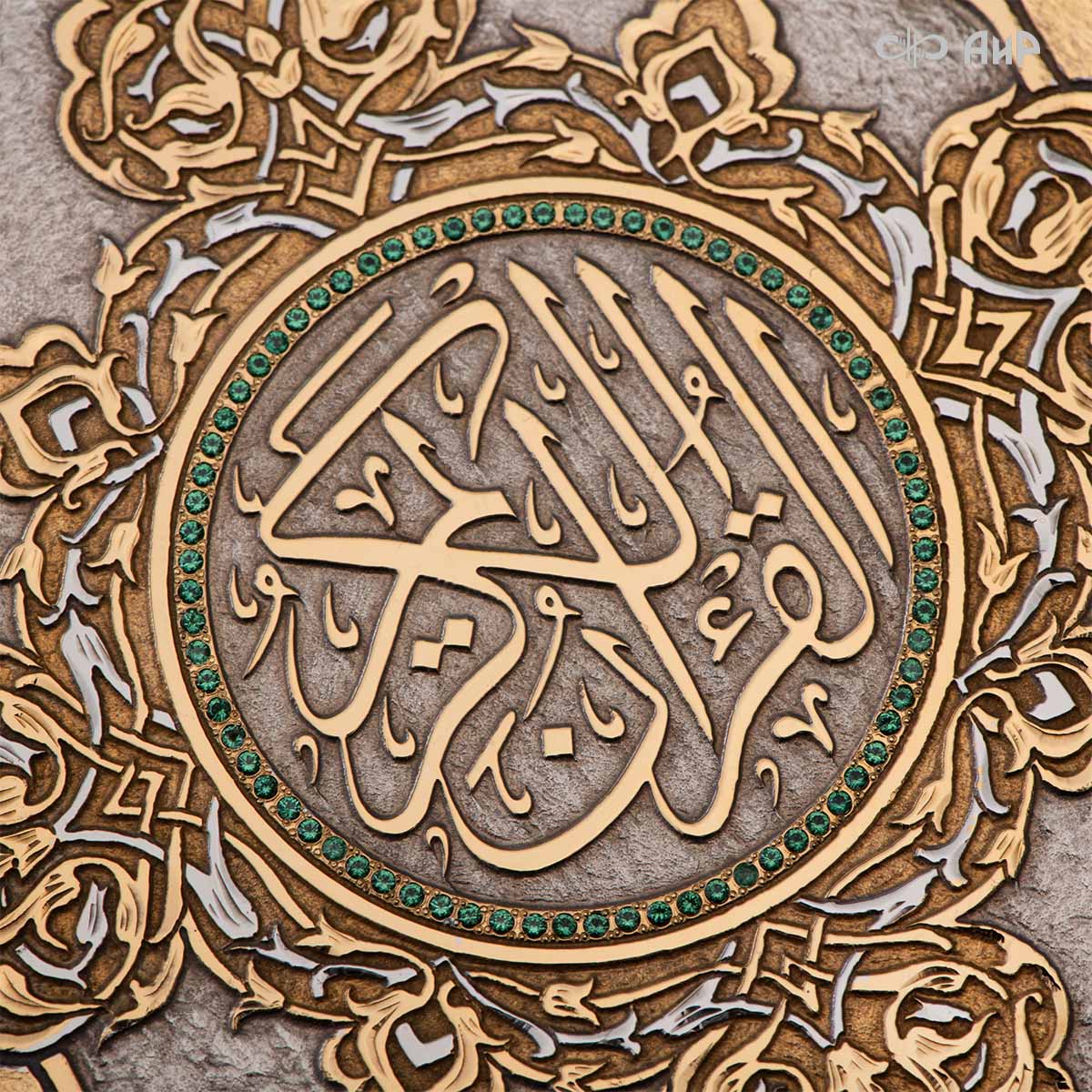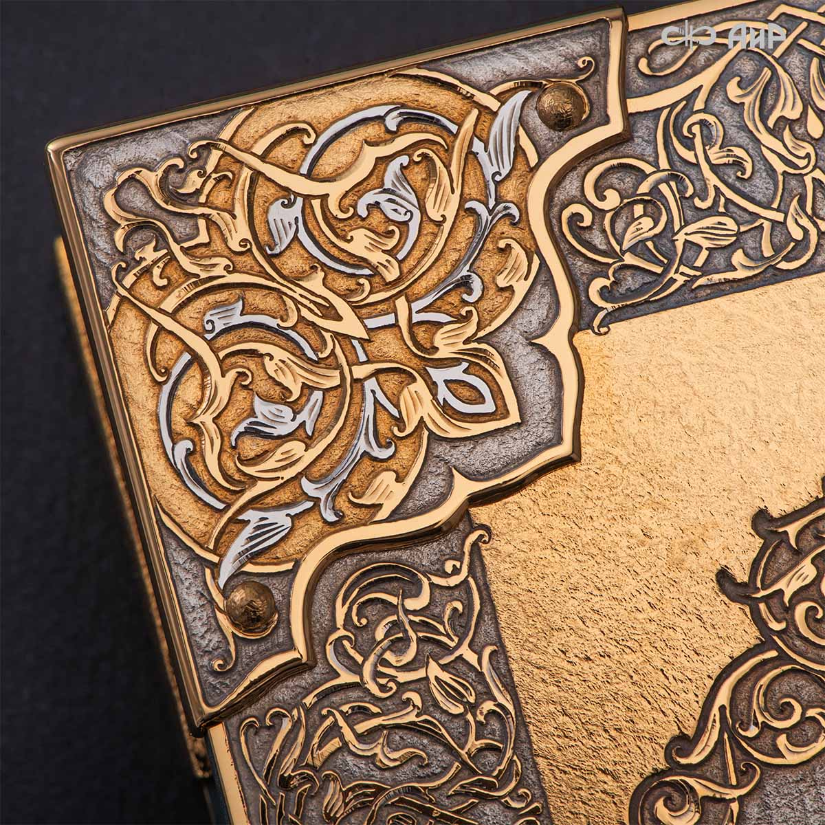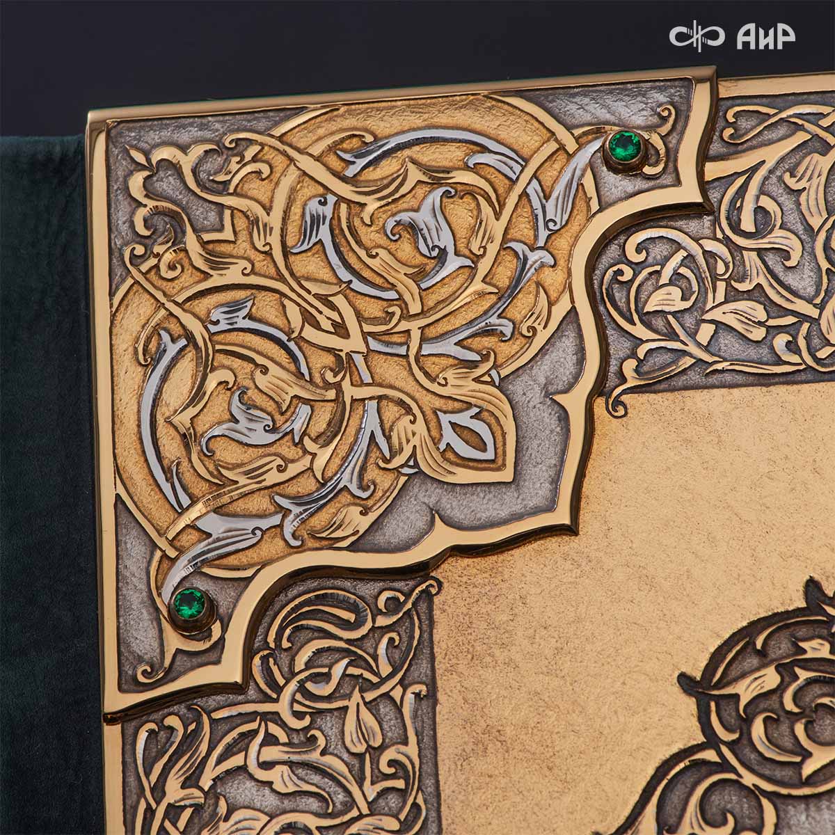 Оклад для Корана - священной книги мусульман, изготовлен в стиле златоустовской гравюры на металле, покрыт золотом и серебром высшей пробы. Узор на лицевой и оборотной сторонах оклада выполнен в восточных мотивах с арабской вязью.