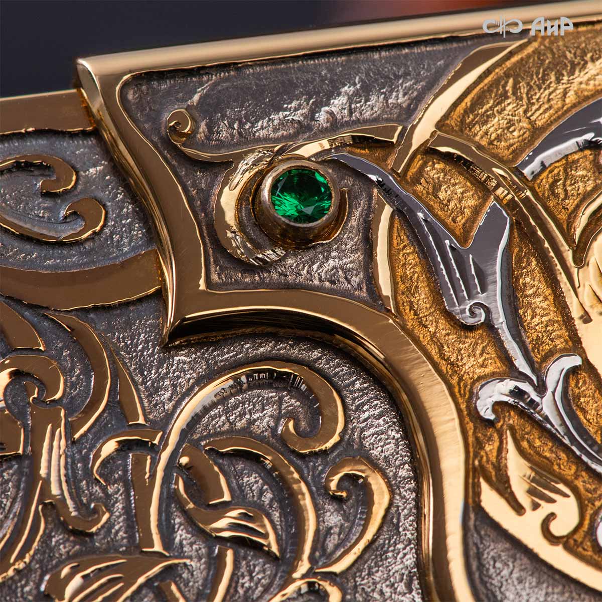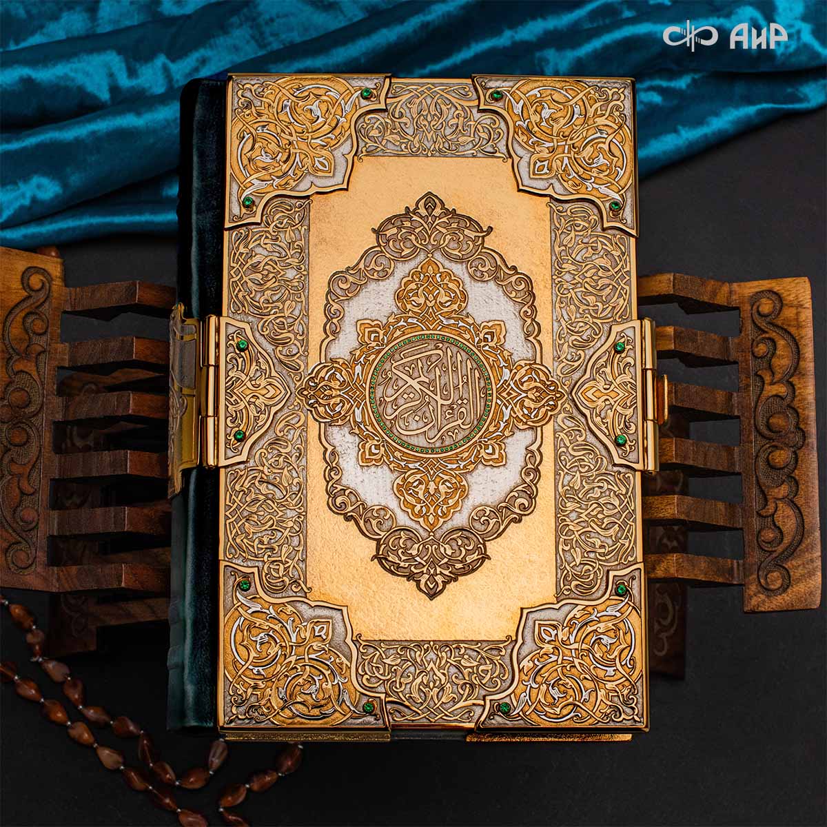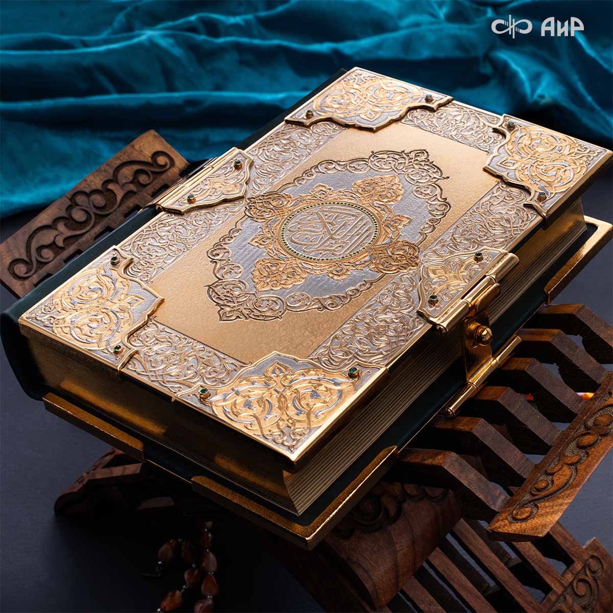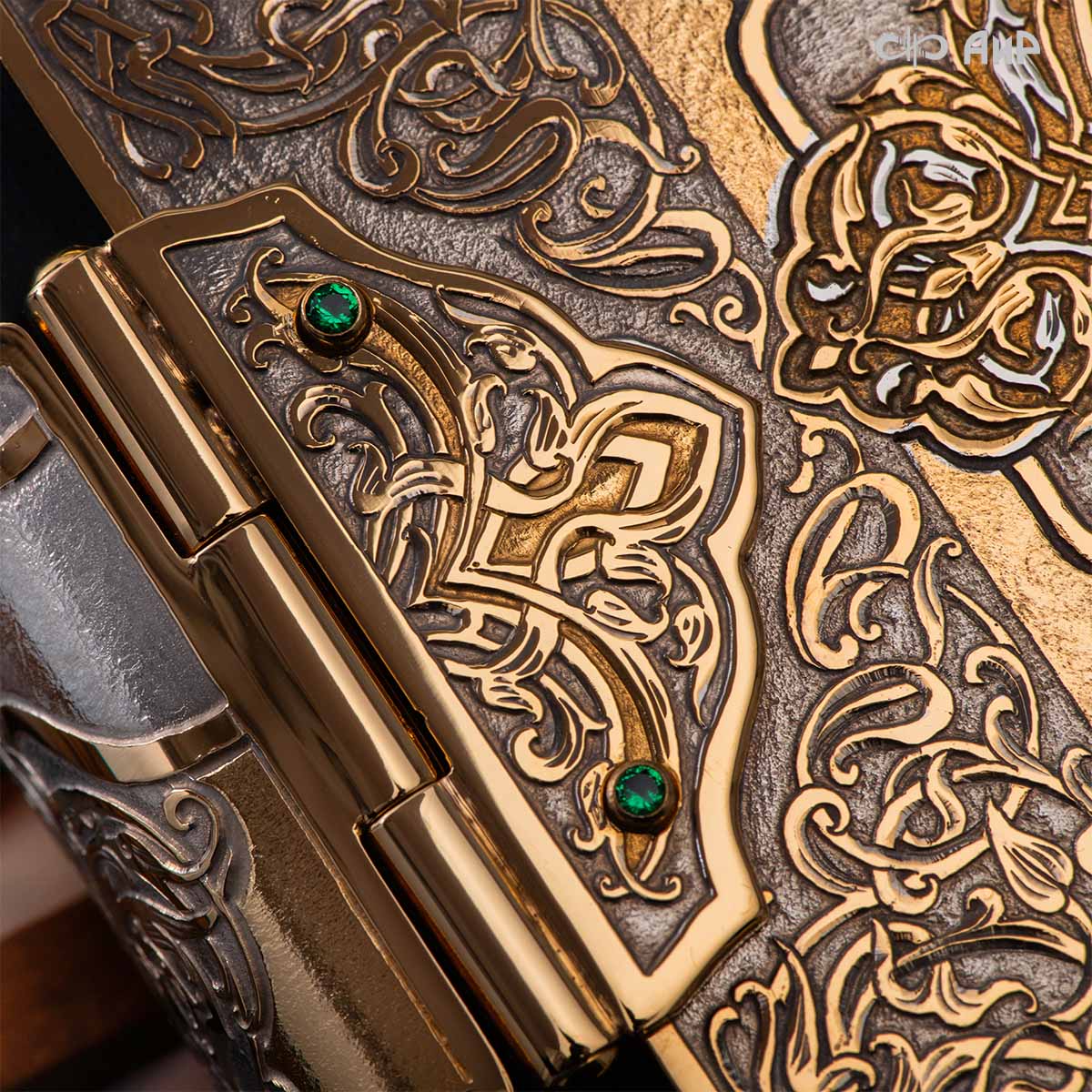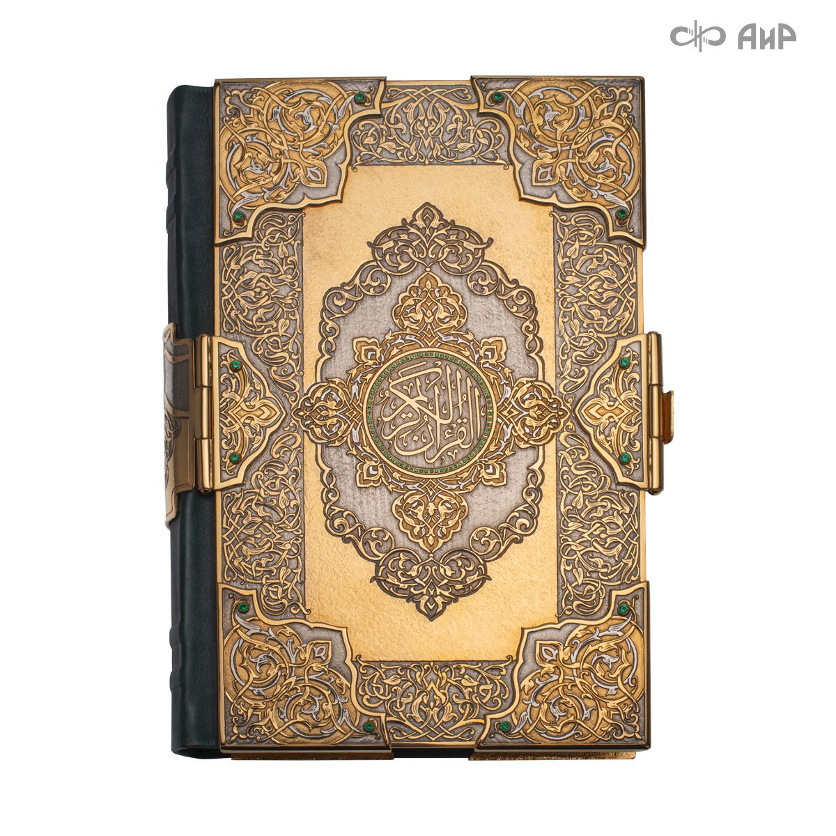 Оклад для Корана - священной книги мусульман, изготовлен в стиле златоустовской гравюры на металле, покрыт золотом и серебром высшей пробы. Узор на лицевой и оборотной сторонах оклада выполнен в восточных мотивах с арабской вязью.