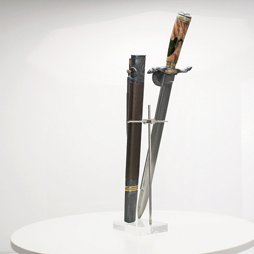 Оружейники и художники Компании «АиР», авторы современной версии хиршфангера, создали изделие в духе европейских традиций. Большой кинжал имеет клинок из атмосферостойкого дамаска ZLADINOX ZDI-1016, прямой, однолезвийный, с одним широким долом с обеих сторон, боевой конец двулезвийный. Рукоять изготовлена из стабилизированного капа (Buckeye Burl). Окончания крестовины загнуты в противоположные стороны и выполнены в виде ножек оленя. Под крестовиной располагается декоративный щитик в виде раковины, декорированной в стиле златоустовской гравюры на металле. Отличительная черта охотничьего кортика ‒ ножны, в которых сделан дополнительный карман для хранения вкладного малого ножа с клинком из атмосферостойкой дамасской стали ZLADINOX ZDI-1016. Обычно он используется для разделки дичи или для бытовых нужд герцогов и монархов. Ножны и клинок украшены в стиле королевских и егерских хиршфангеров: элементы с изображениями желудей, дубовых листьев и геральдических знаков.