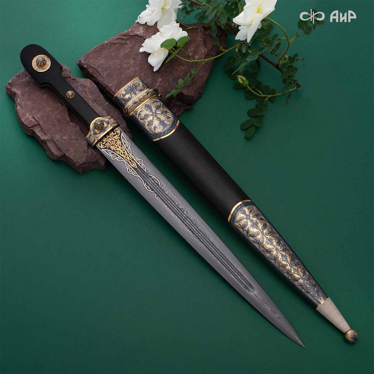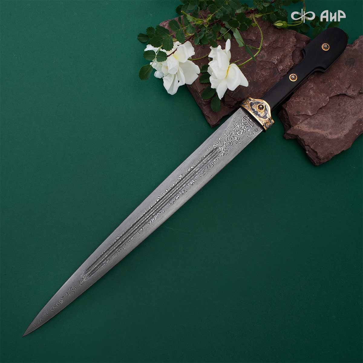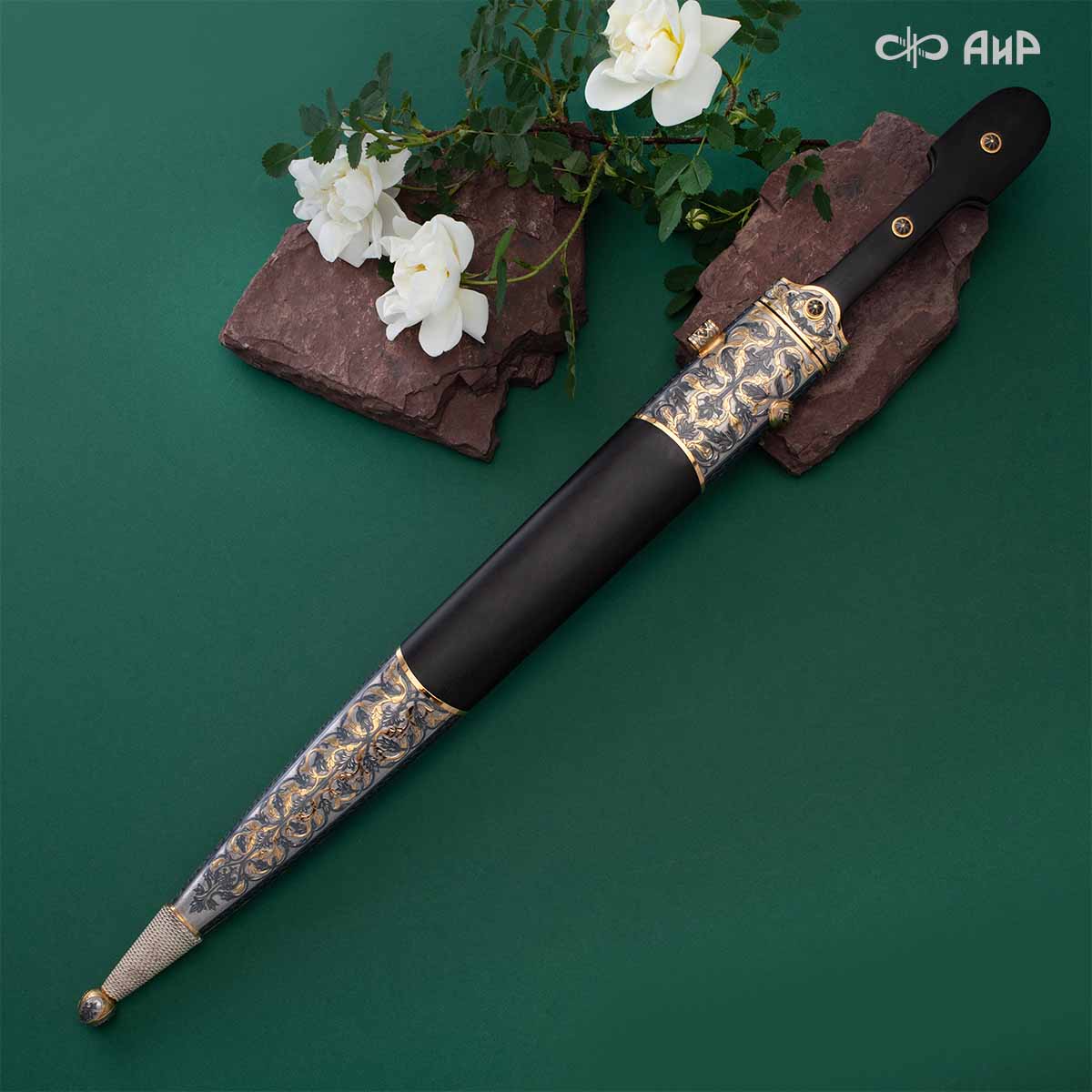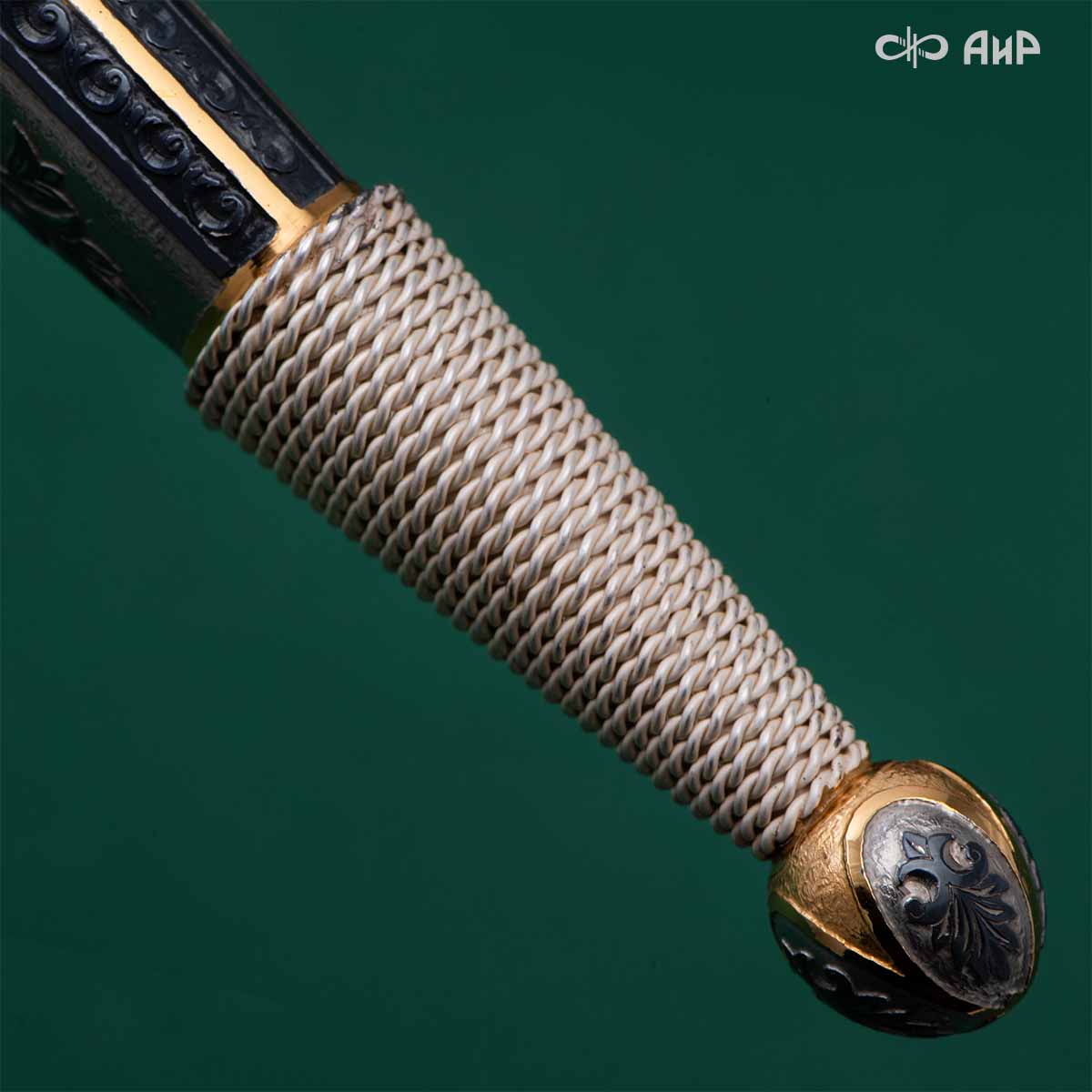 Компания «АиР» изготавливает кинжалы кавказского типа, украшенные золотом, серебром или мельхиором. Каждый кинжал – это яркий пример ручной работы и вдохновенного коллективного творчества. Оружейники, художники и граверы компании достойно хранят и развивают златоустовские традиции декорирования металла. В процессе создания каждого изделия соединяются талант, творческий подход и высокий уровень исполнения. Представленный экземпляр богато украшен орнаментом.