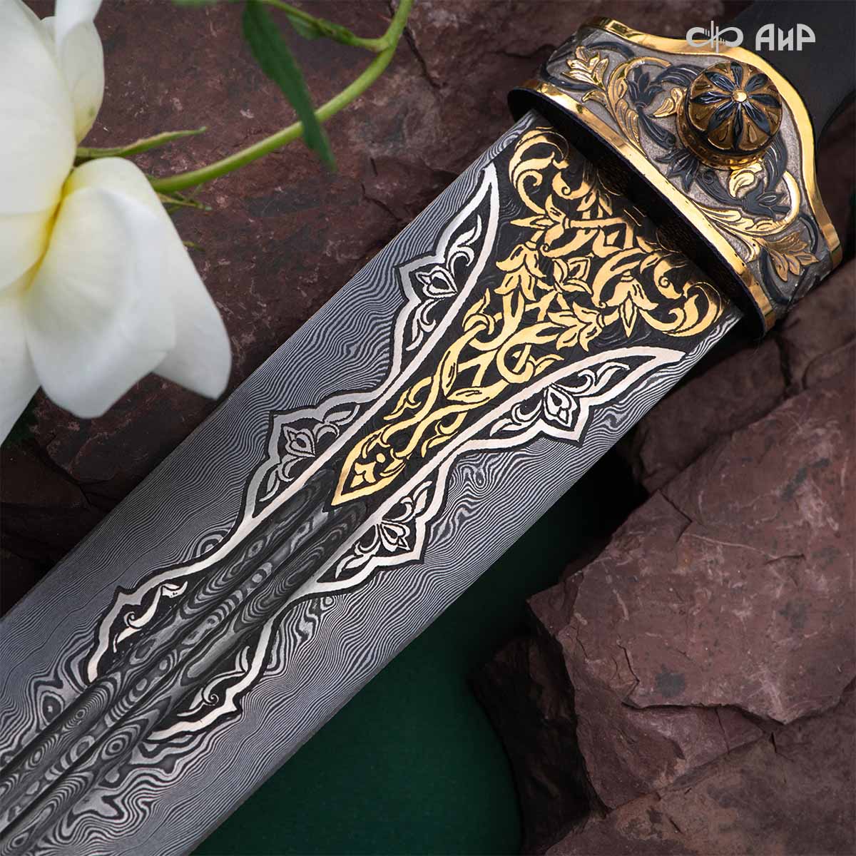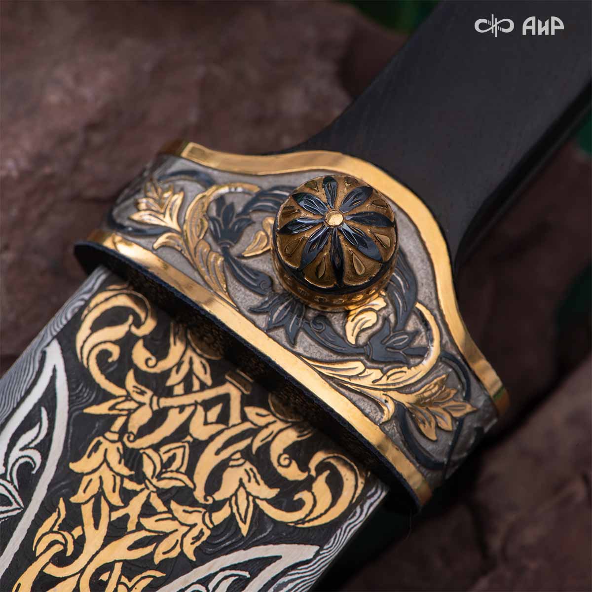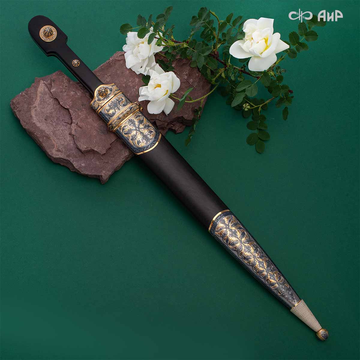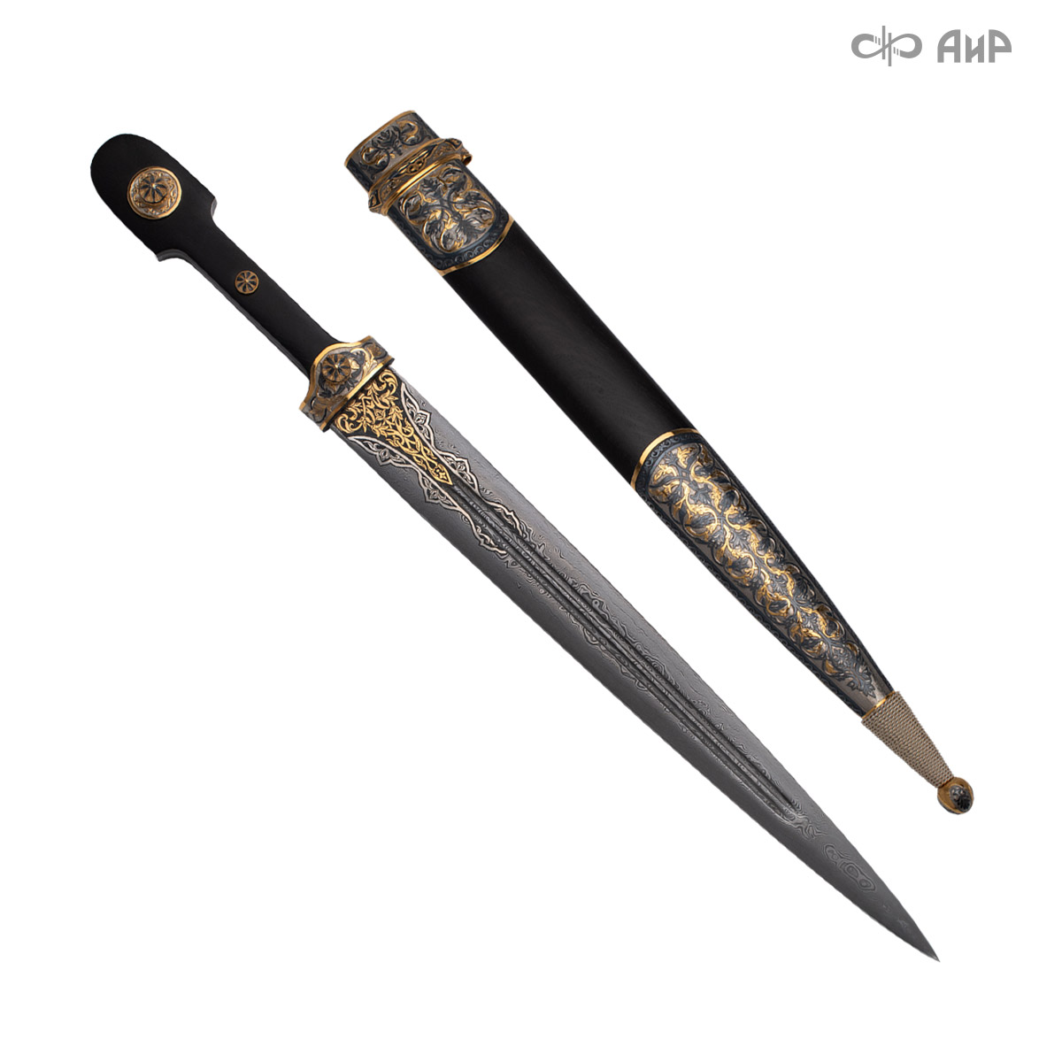 Компания «АиР» изготавливает кинжалы кавказского типа, украшенные золотом, серебром или мельхиором. Каждый кинжал – это яркий пример ручной работы и вдохновенного коллективного творчества. Оружейники, художники и граверы компании достойно хранят и развивают златоустовские традиции декорирования металла. В процессе создания каждого изделия соединяются талант, творческий подход и высокий уровень исполнения. Представленный экземпляр богато украшен орнаментом.