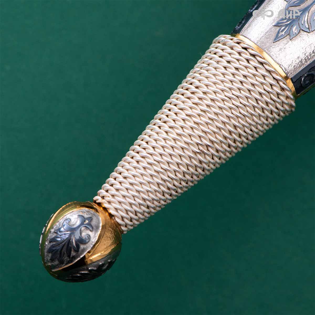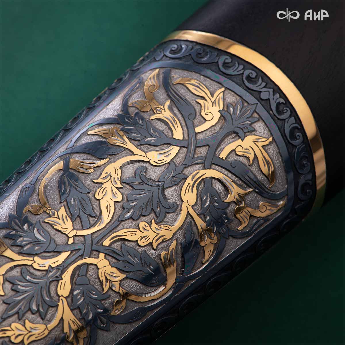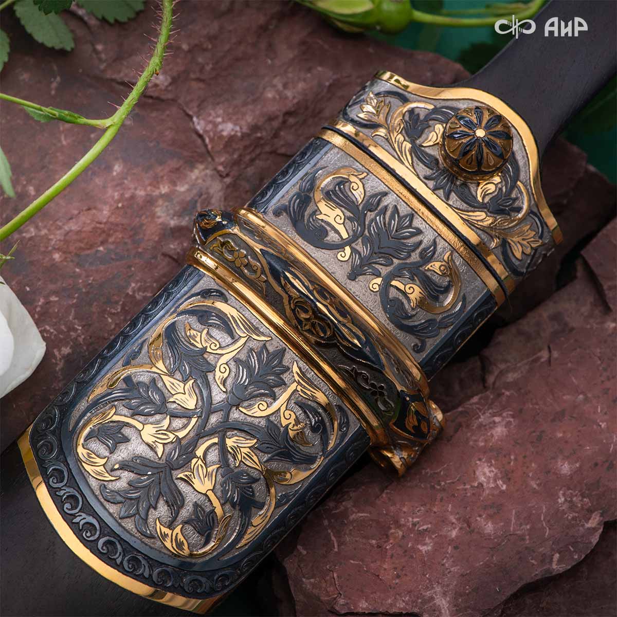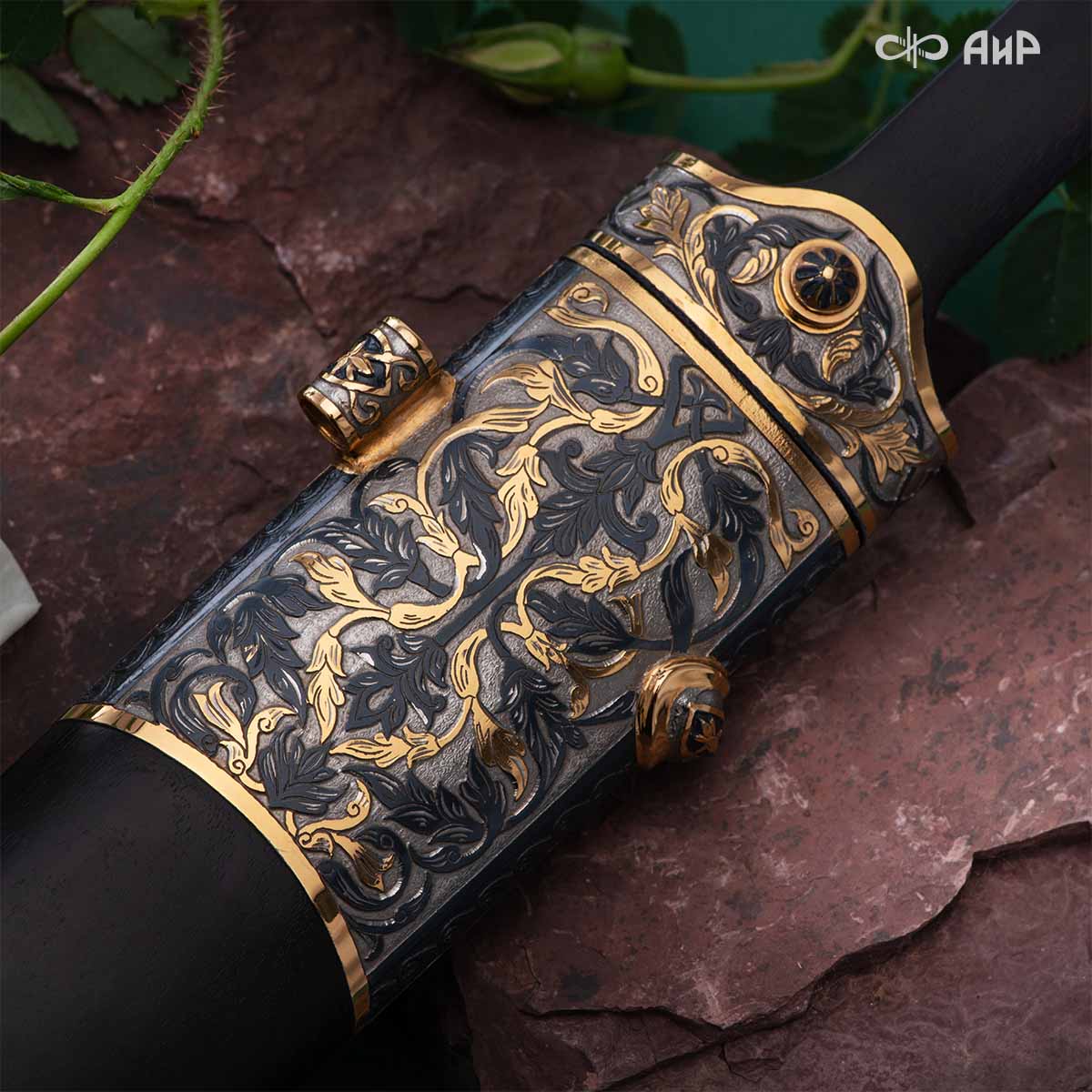Компания «АиР» изготавливает кинжалы кавказского типа, украшенные золотом, серебром или мельхиором. Каждый кинжал – это яркий пример ручной работы и вдохновенного коллективного творчества. Оружейники, художники и граверы компании достойно хранят и развивают златоустовские традиции декорирования металла. В процессе создания каждого изделия соединяются талант, творческий подход и высокий уровень исполнения. Представленный экземпляр богато украшен орнаментом.