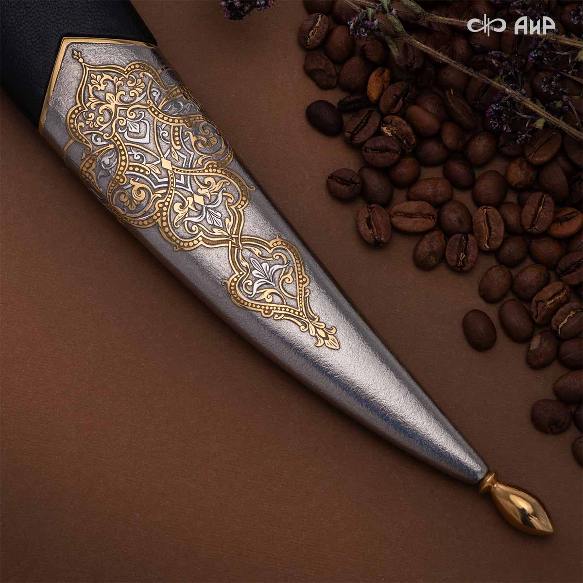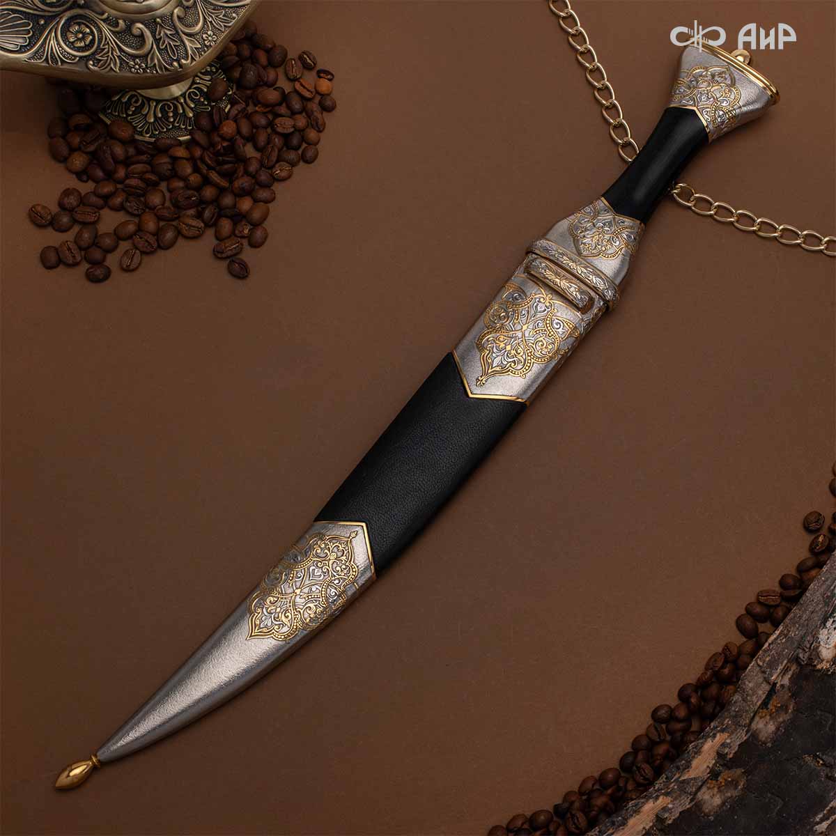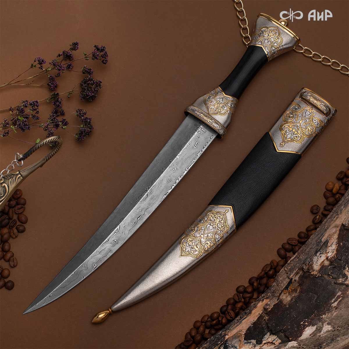 Кинжал восточного типа из дамасской стали, украшенный золотом – подарок, символизирующий харизму, силу и мужественность своего обладателя.