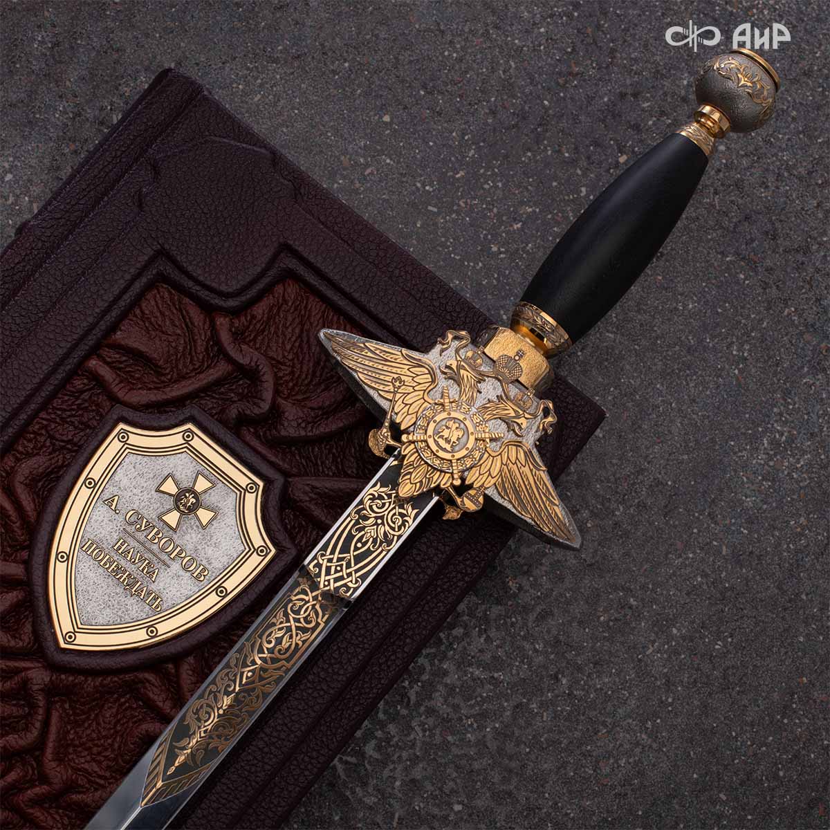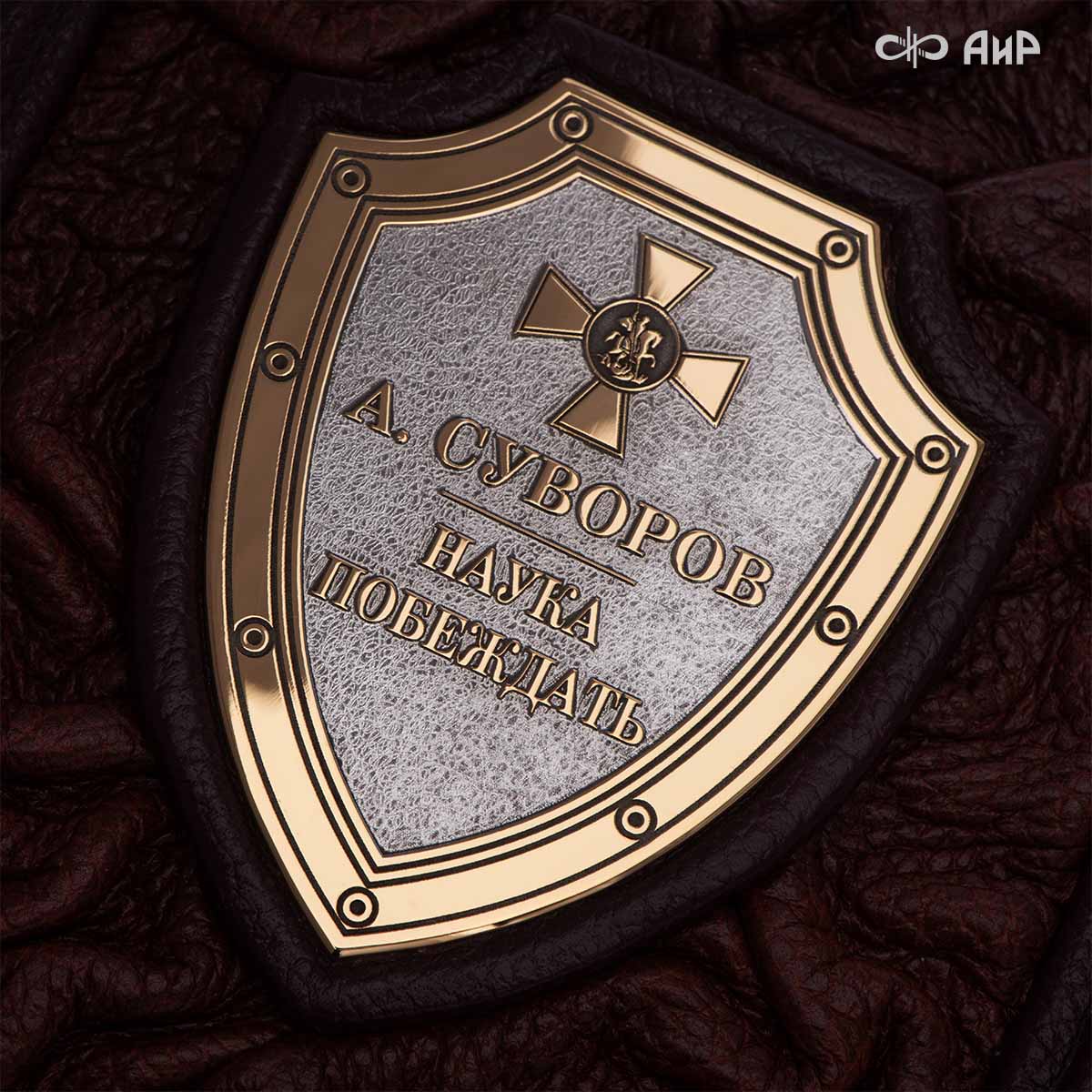 В наборе с кортиком предлагается подарочная книга «Суворов А.В. Наука побеждать». Это замечательное издание, содержащее историю побед великого полководца во всех подробностях. Удивительная автобиография, правдивое описание походов и важных событий в жизни, стихотворения известных авторов об Александре Суворове, его собственные высказывания и наиболее удачные афоризмы напечатаны на ярких страницах в разноцветных рамках. Внешнее убранство издания вполне соответствует богатому содержанию. Твердый, изготовленный по древней технологии вручную кожаный переплет украшен вставками из мятки, специально изготовленными табличками и тиснением золотой фольгой. Для прочности и удобства в книгу вставлены плотные цветные форзацы и шелковый ляссе.