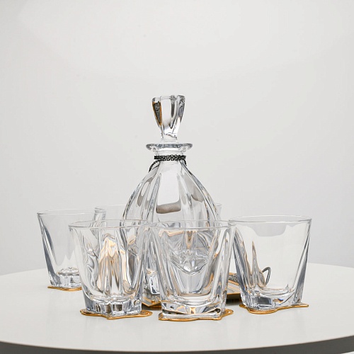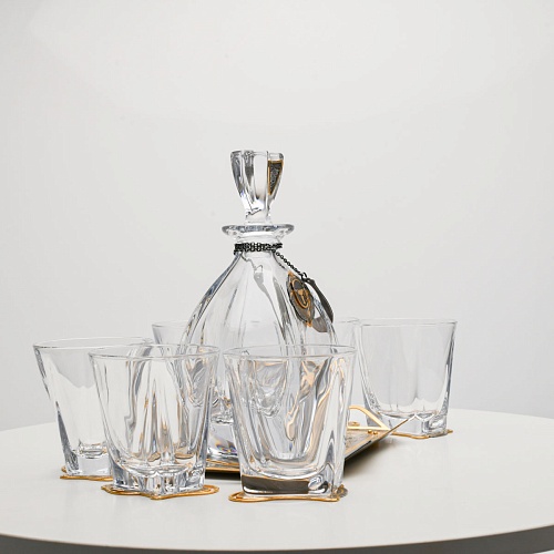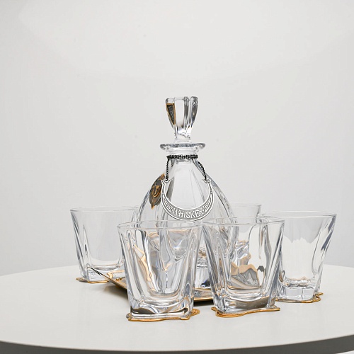 В набор для виски "Rodeo" входят шесть бокалов, поднос и штоф объемом 750 мл из богемского стекла. Поднос, бокалы и штоф украшены в художественном стиле златоустовской гравюры на металле. У стеклянных бокалов и штофа на дне имеются украшенные металлические подставки. Кроме того, стеклянная пробка штофа также декорирована накладкой.