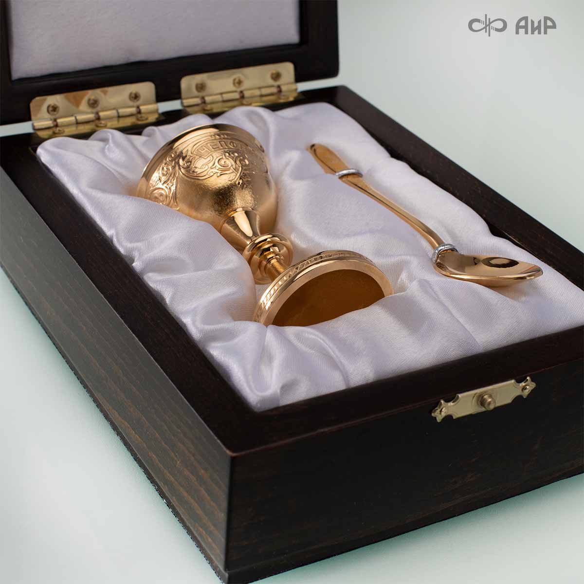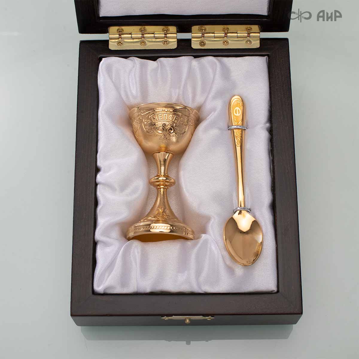 Пашотница имеет форму небольшой рюмочки на ножке. Основание и боковые стороны пашотницы и ложечки украшены растительным орнаментом и логотипом заказчика "ЧЕПФА".