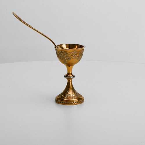 Пашотница имеет форму небольшой рюмочки на ножке. Основание и боковые стороны пашотницы и ложечки украшены растительным орнаментом.