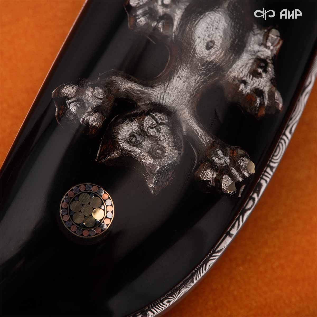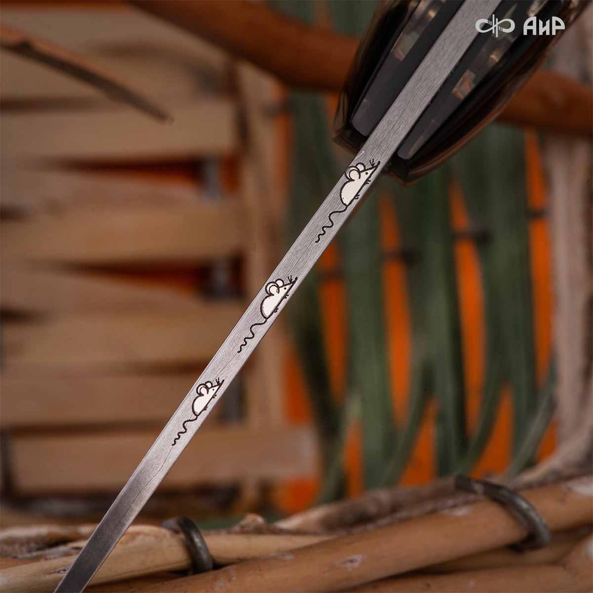 Авторский нож с шуточным сюжетом игры в "кошки-мышки", в которой хитроумная мышь всегда убегает от простодушного кота.