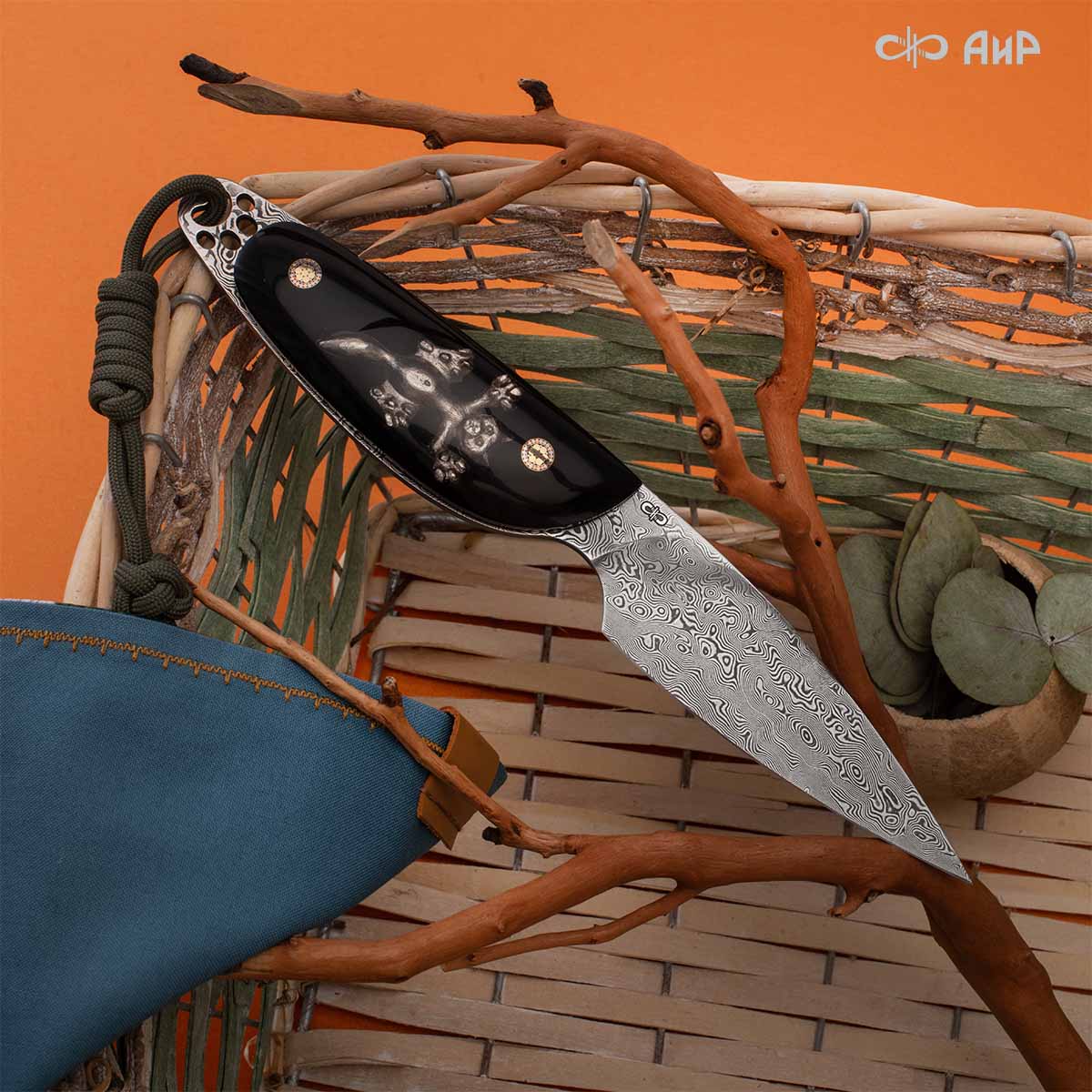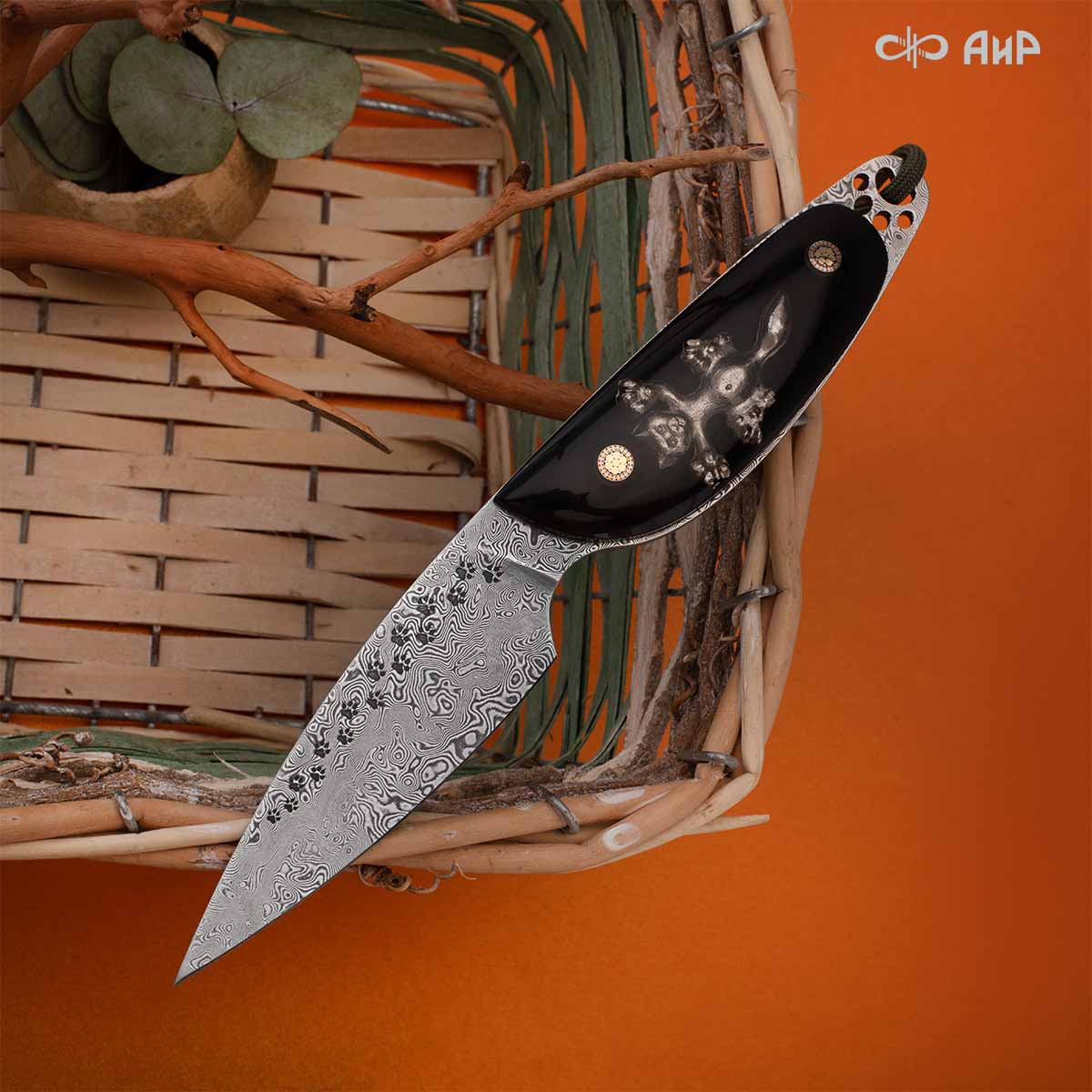 Вот и наших мастеров вечное противостояние котов и мышей не оставило равнодушными и подвигло на создание ножа «Котэ». Этот кот долго жил себе в своем уютном домике и горя не знал, как вдруг в доме завелись мыши. Да не просто мыши, а настоящие проказницы, которые крали его еду и мешали спать! Попытался было кот с ними подружиться, но так и не смог. Ну никак не удавалось им жить дружно. Стал усатый их тогда ловить, да и сам угодил в ловушку, а хитрые грызуны разбежались. Не повезло нашему пушистику, застрял он в рукояти из ювелирного полимера, а мышата спрятались на обухе клинка из дамасской стали Zladinox. Но простодушный кот всё равно ни на кого зла не держит, на ноже «Котэ» места всем хватает.