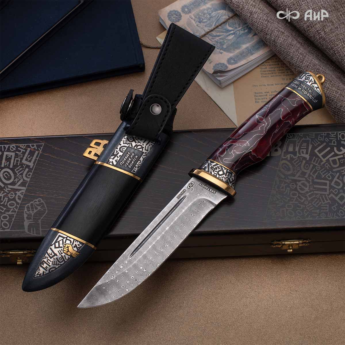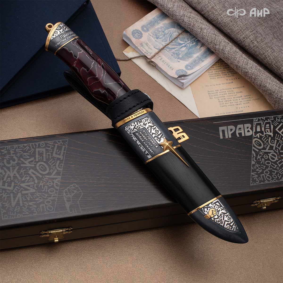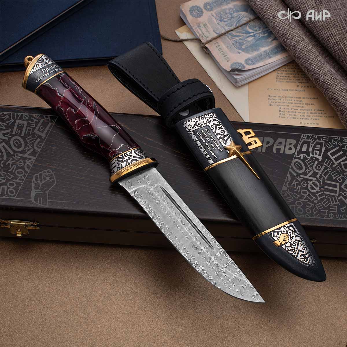 Авторский нож "Правда" с рукоятью из композита с алюминиевой микросеткой (узор "волны", цвет красный), с клинком из дамасской стали ZLADINOX и ножнами, оформленными в газетном стиле шрифтами советской эпохи.