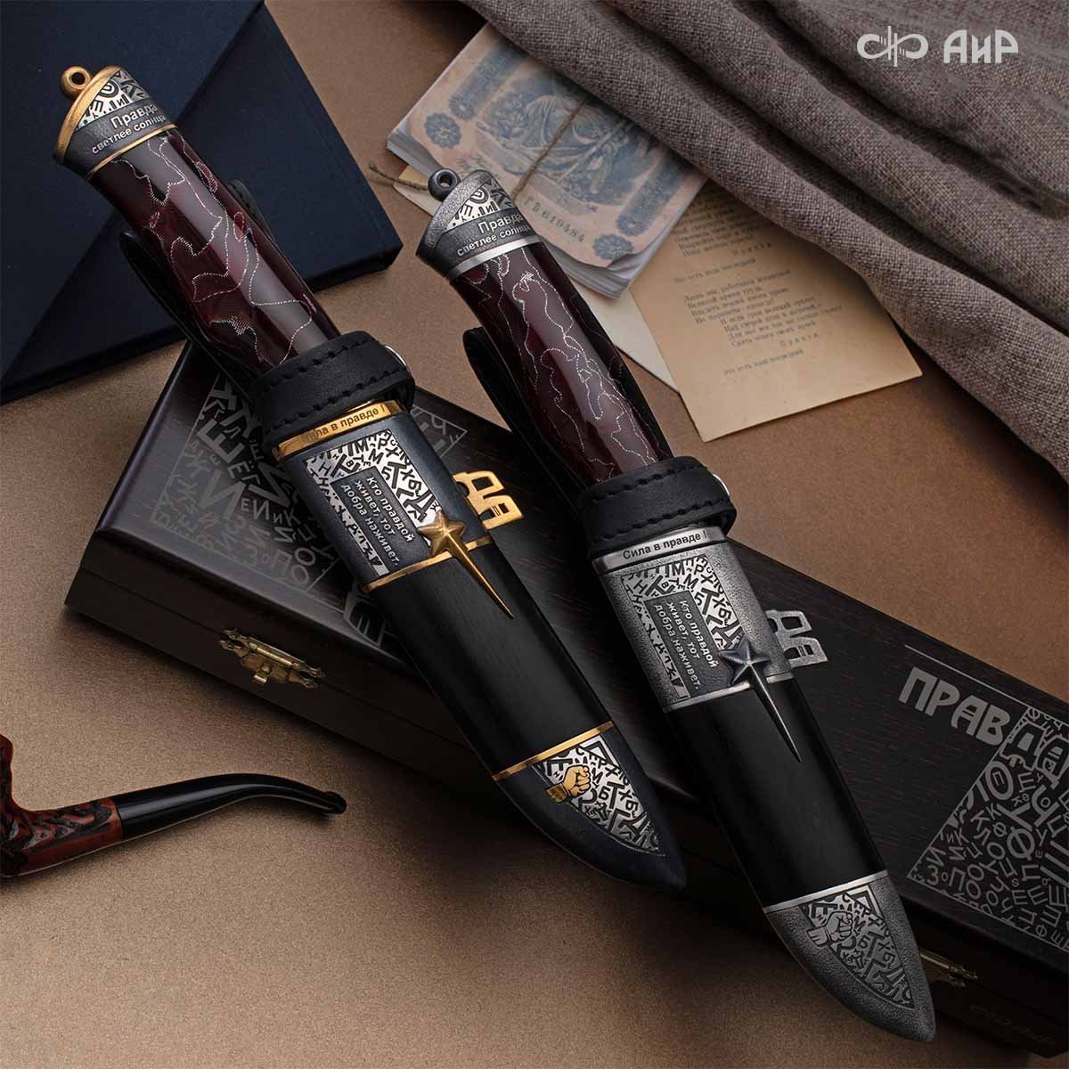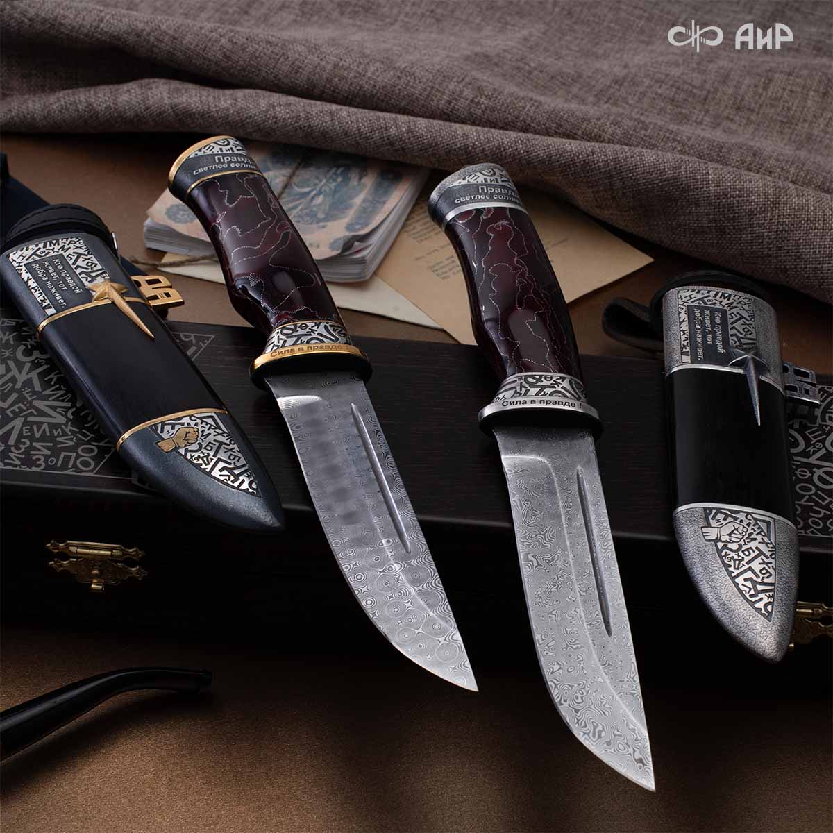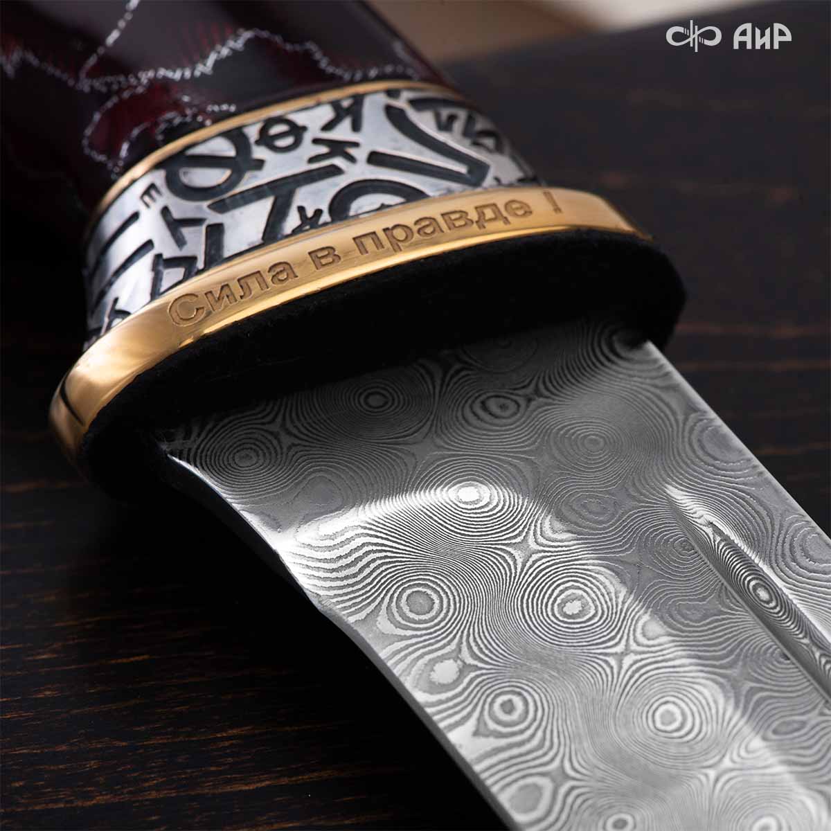 Авторский нож "Правда" с рукоятью из композита с алюминиевой микросеткой (узор "волны", цвет красный), с клинком из дамасской стали ZLADINOX и ножнами, оформленными в газетном стиле шрифтами советской эпохи.